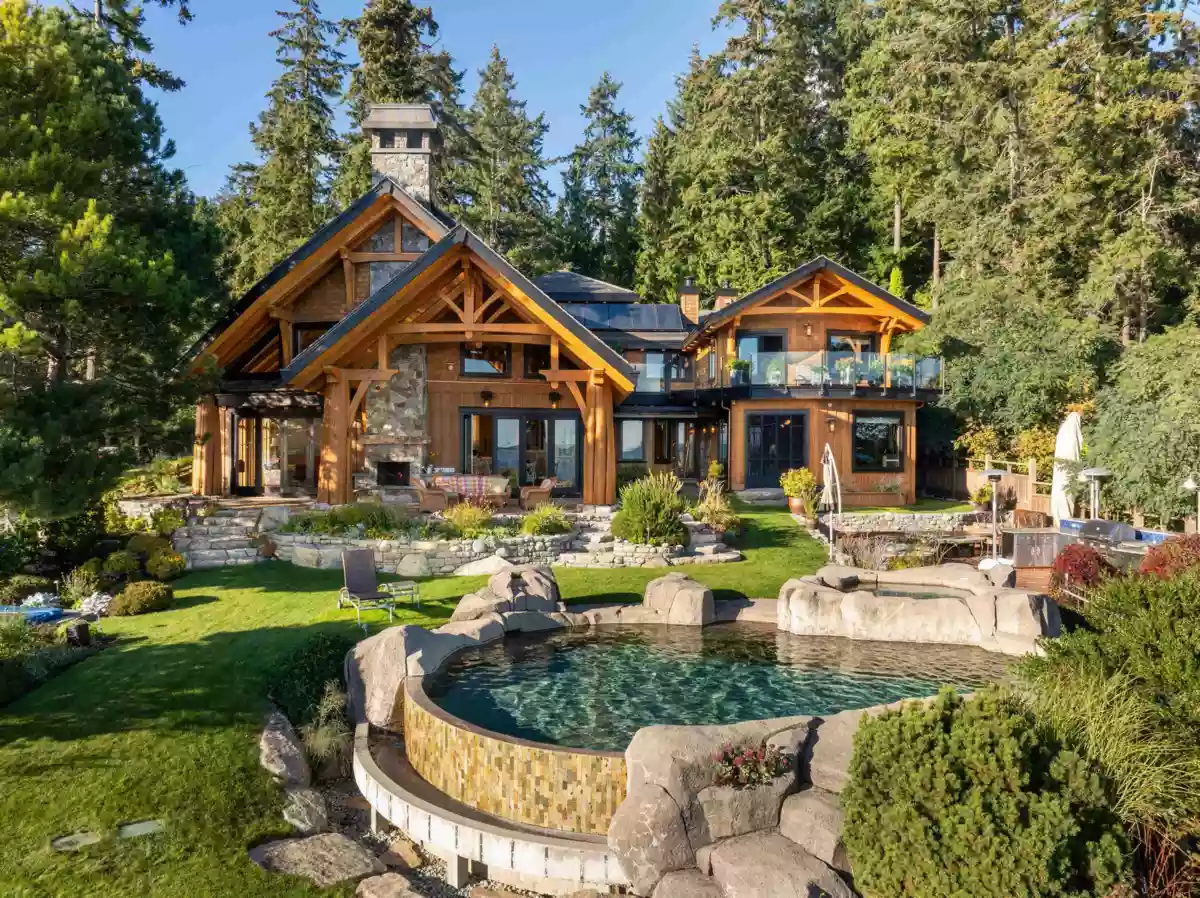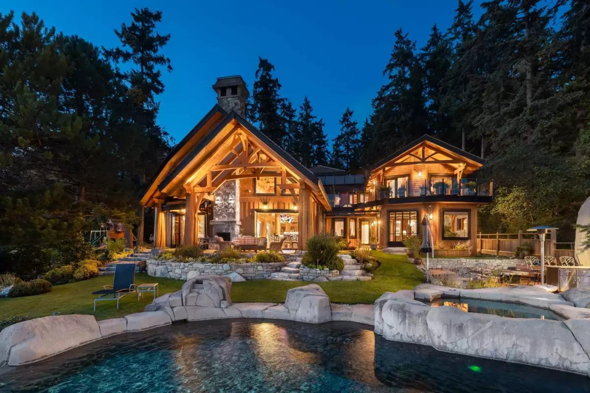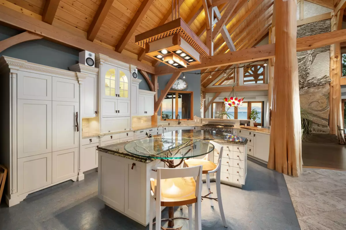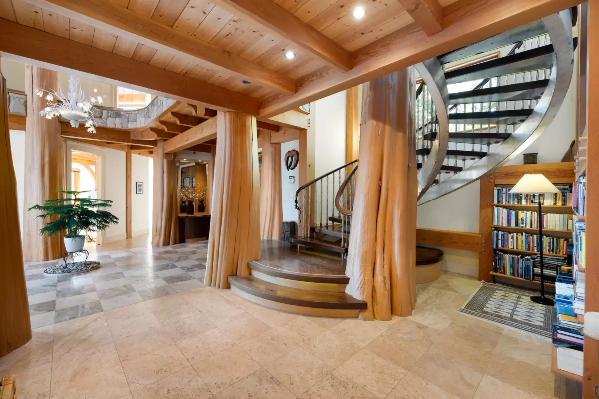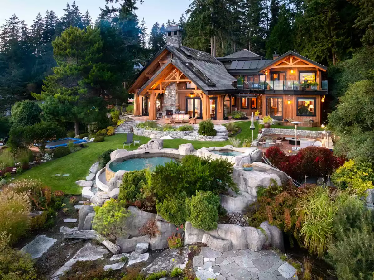 Perched majestically on a magnificent .96 acre waterfront estate, this West Coast timbered masterpiece redefines coastal elegance with its seamless fusion of raw nature and refined craftsmanship. This extraordinary custom built oceanfront residence is a symphony of heavy Douglas fir timbers, their rich grain exposed in soaring, vaulted ceilings that frame unobstructed Pacific vistas providing a wonderful indoor outdoor living experience like no other. The open-concept floor plan provides entertainment size principal rooms. Each of the 5 bedrooms feels like a serene retreat enveloped by the rhythmic pulse of the ocean below. Terraced gardens cascade down the bluff blurring the line between architecture and landscape.