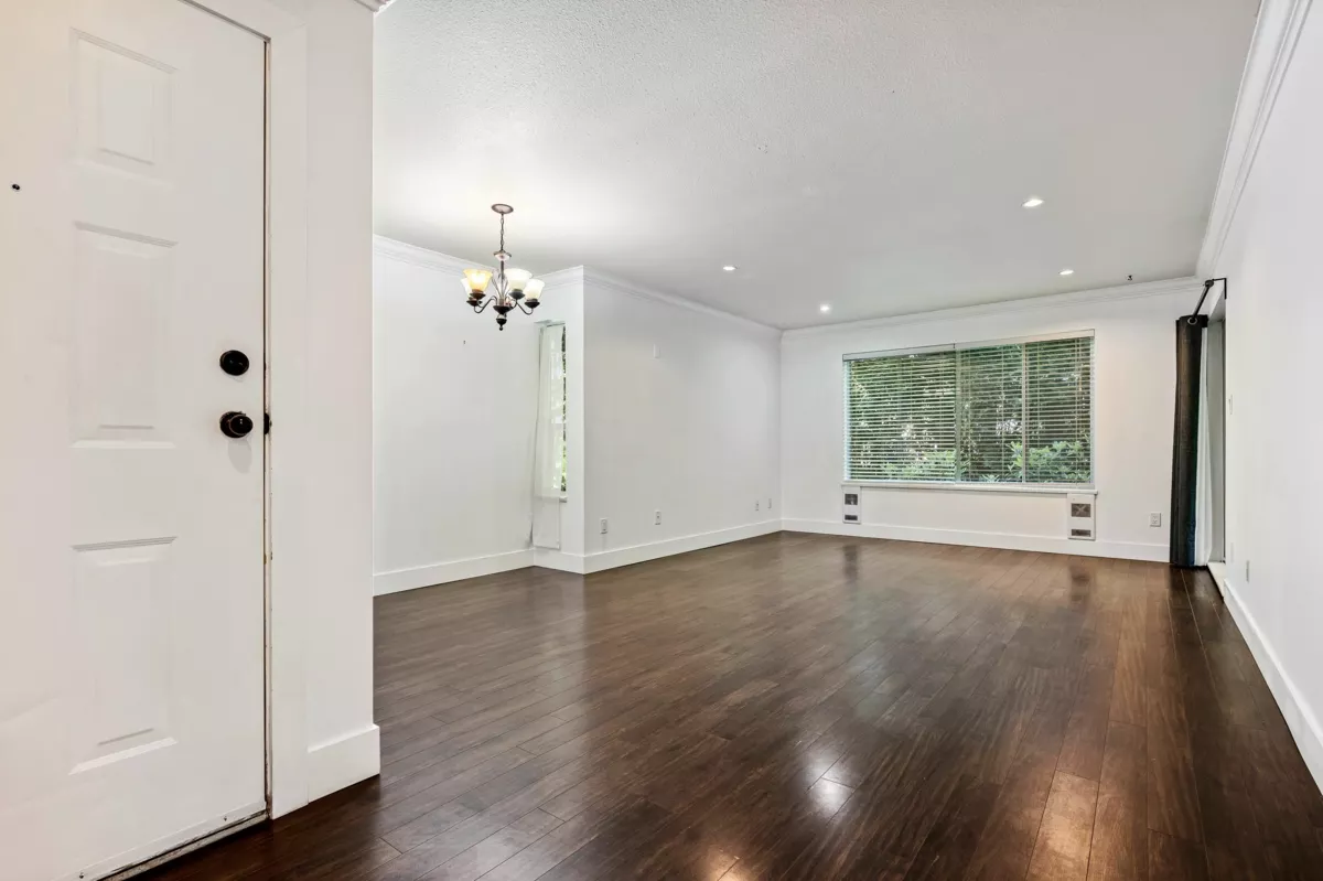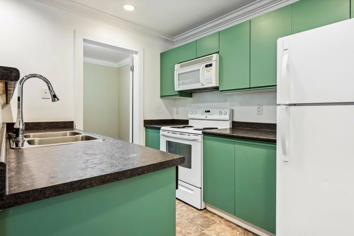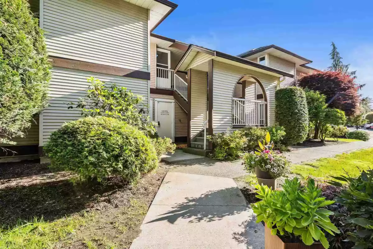 GROUND FLOOR CORNER SUITE in the back ZEN CORNER of the complex- a peaceful quiet location w/ no neighbors looking in! This BRIGHT 2 bdrm and 1 bathroom home features modern flooring, paint, crown mouldings, & a stunning backdrop of NATURE AT YOUR DOORSTEP from every window. Relax in the large living space, step outside to the covered patio, or enjoy your meal in the spacious dining area w/ corner windows. Upgraded washer/dryer, flooring (no carpets!), in-suite storage, & a beautiful primary suite w/ his/her closets that leads to the ensuite. The perfect place for ANYONE in all walks of life- this complex is close to all major amenities and welcomes all ages and pets. Parking stall #28 is included and ample visitor parking available. Immediate possession possible!