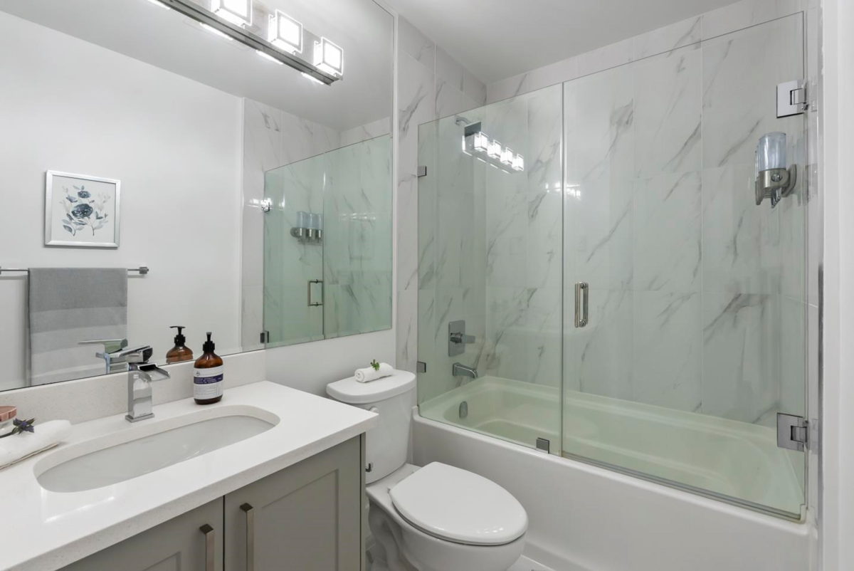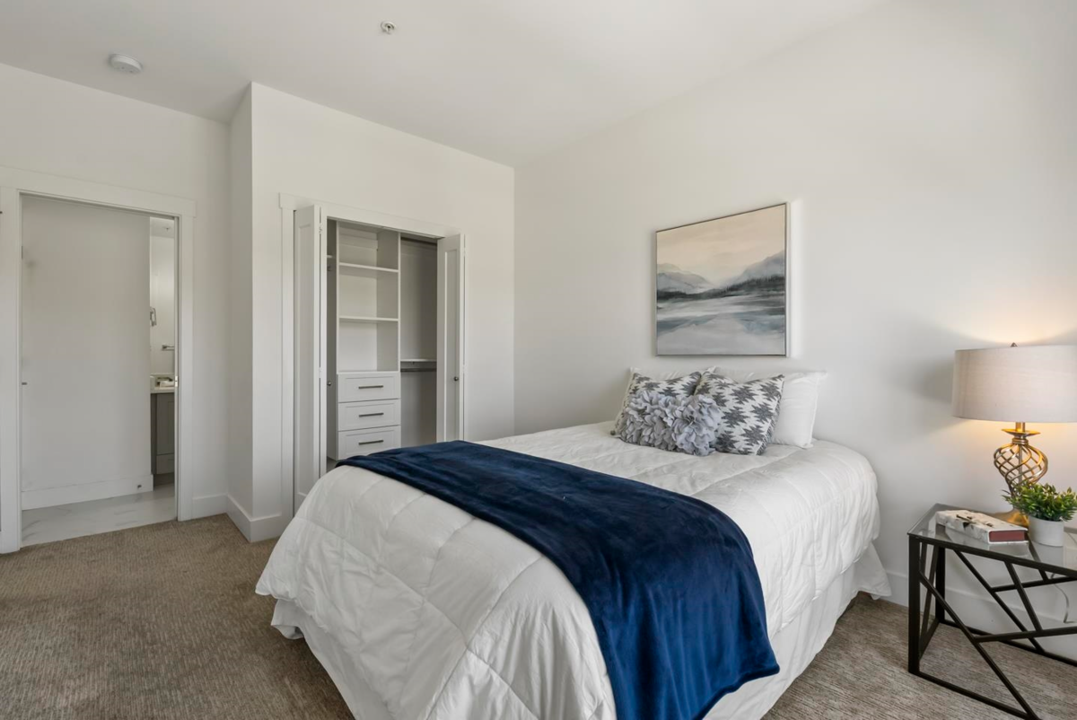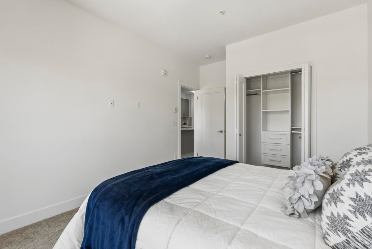 Welcome to Fraser Landmark! This modern 1 bed + junior bedroom condo unit offers 620 SF of bright, functional living just 1 minute from the future SkyTrain. It features an open layout with light-toned wood-look flooring, a sleek kitchen with quartz countertops, stainless steel appliances, and a large island. The spacious 130 SF primary bedroom has built-in closets, while the marble-inspired bath includes a glass-enclosed tub/shower. Large windows flood the space with natural light and urban views. Enjoy the outdoors on your private balcony. Bonus: 2 parking spots included! Located near shopping, dining, transit, and parks—urban living meets unbeatable convenience.