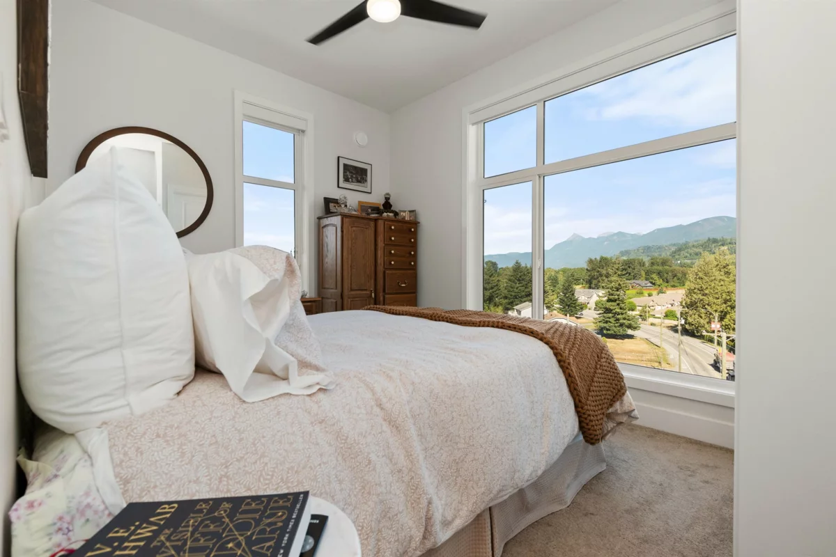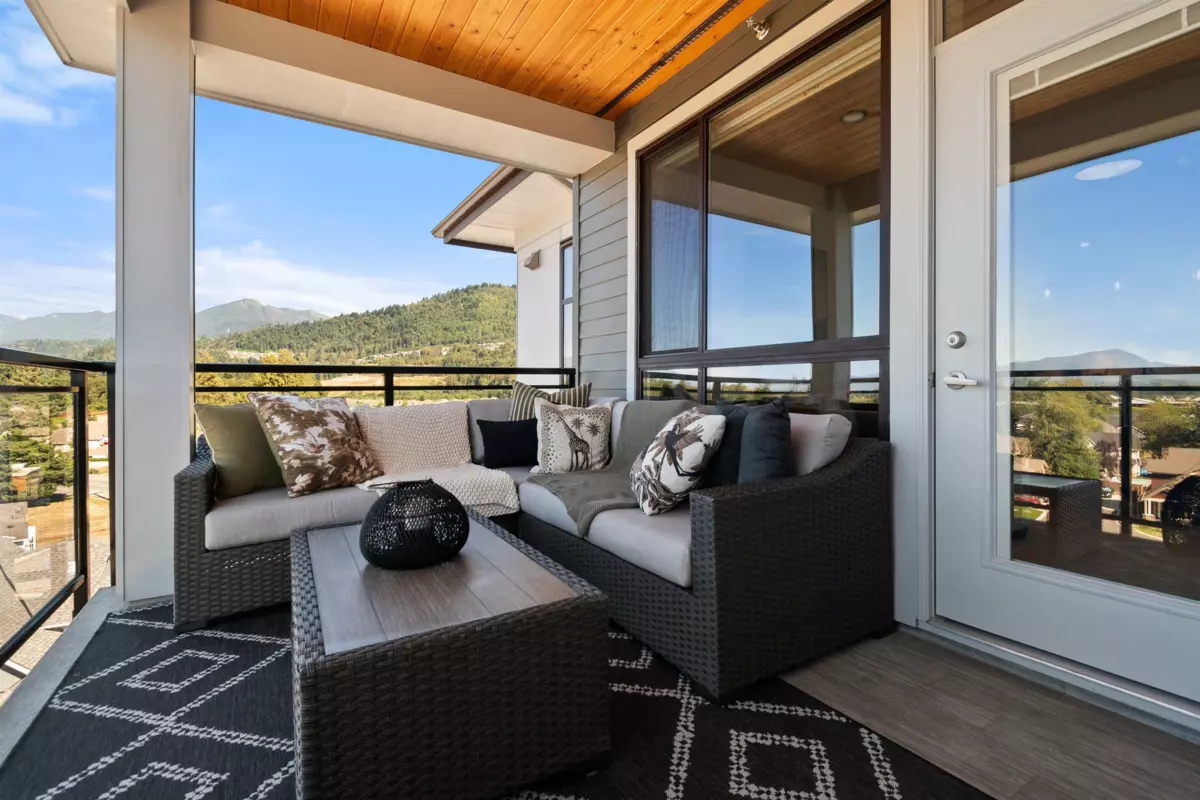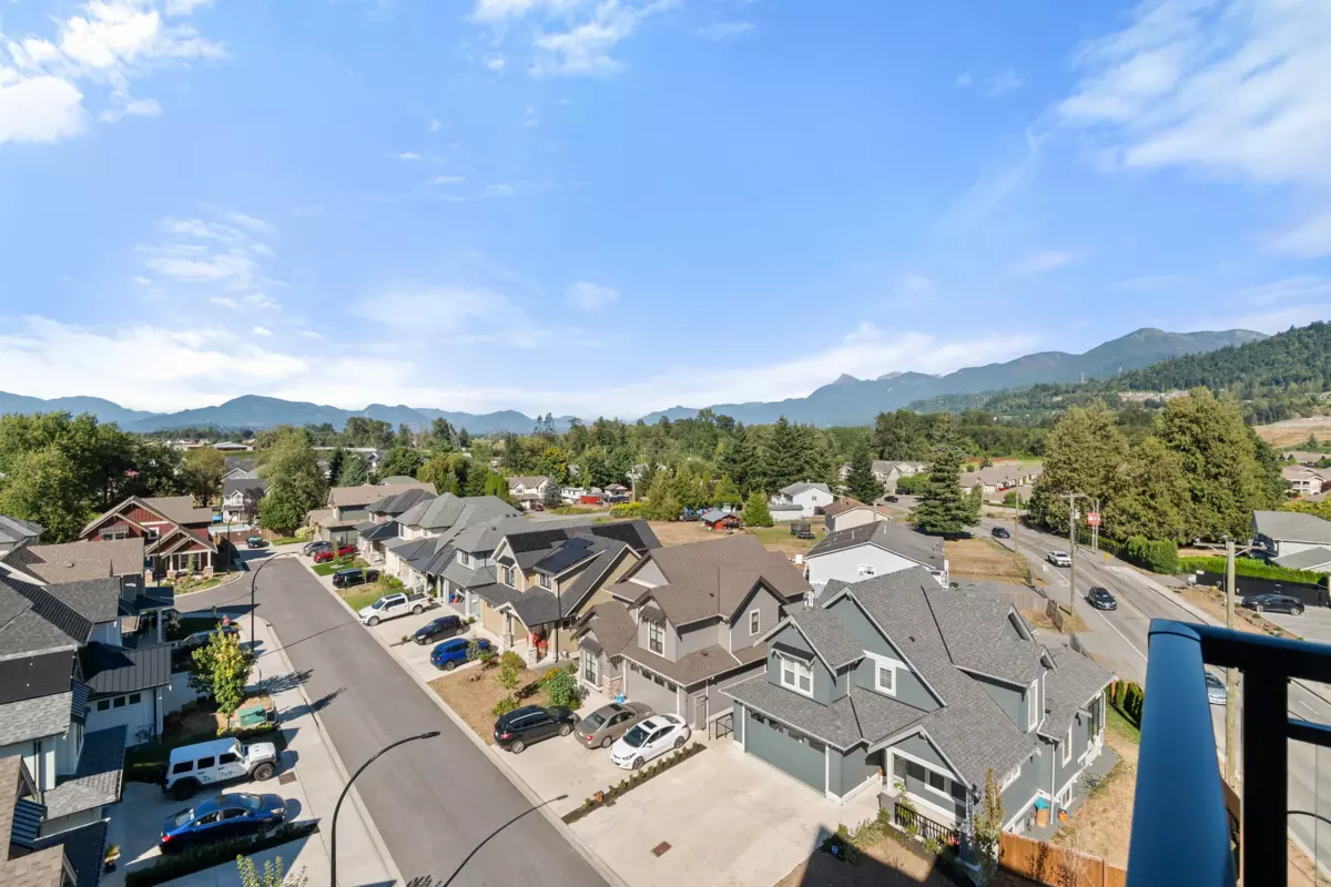 Experience luxurious living in this stunning 1 year old top-floor corner penthouse condo in "The Yearling" at the Ironhorse development. This 2-bedroom, 2-bathroom home boasts high ceilings and an expansive private covered deck with breathtaking mountain views. Modern amenities include stainless steel appliances, stylish tile and laminate flooring, quartz countertops, and an open, airy layout. Enjoy the convenience of 1 underground parking stall and a spacious storage locker. Located in the desirable Sardis area, close to shopping, schools, and parks for kids. Don't miss this incredible opportunity to own a beautiful, move-in-ready penthouse. 2 pets allowed. Dogs or Cats. No Size Restriction.