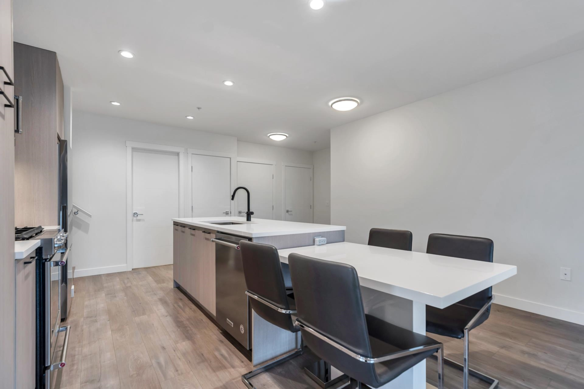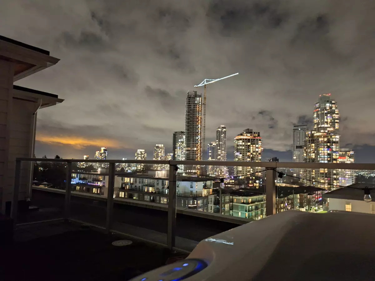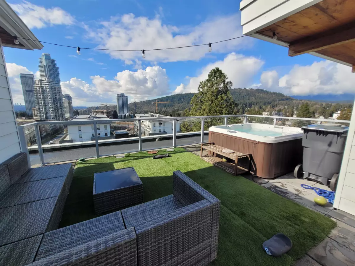 Welcome to YOUR NEW HOME situated in the desirable Coquitlam West Neighborhood. This penthouse unit features 2 bedrooms + 1 den, in addition to 2 bathrooms. The unit boasts a Private 521 Sq Ft rooftop patio on the 7th Floor, equipped with its own hot tub and stunning views of the city and mountains! This unit has a modern layout with an open concept design, along with an 82 Sq Ft balcony off the kitchen. The interior space is furnished with Premium Kitchen Aid stainless steel appliances, gas stove, garburator, and quartz countertops. The laundry is conveniently located within the suite! The property includes 2 standard parking spaces (1 is EV ready) and 2 storage lockers. It is ideally positioned just steps away from the Burquitlam sky train station, shopping centers, schools and parks!