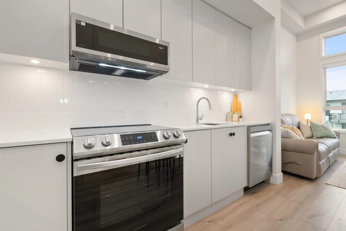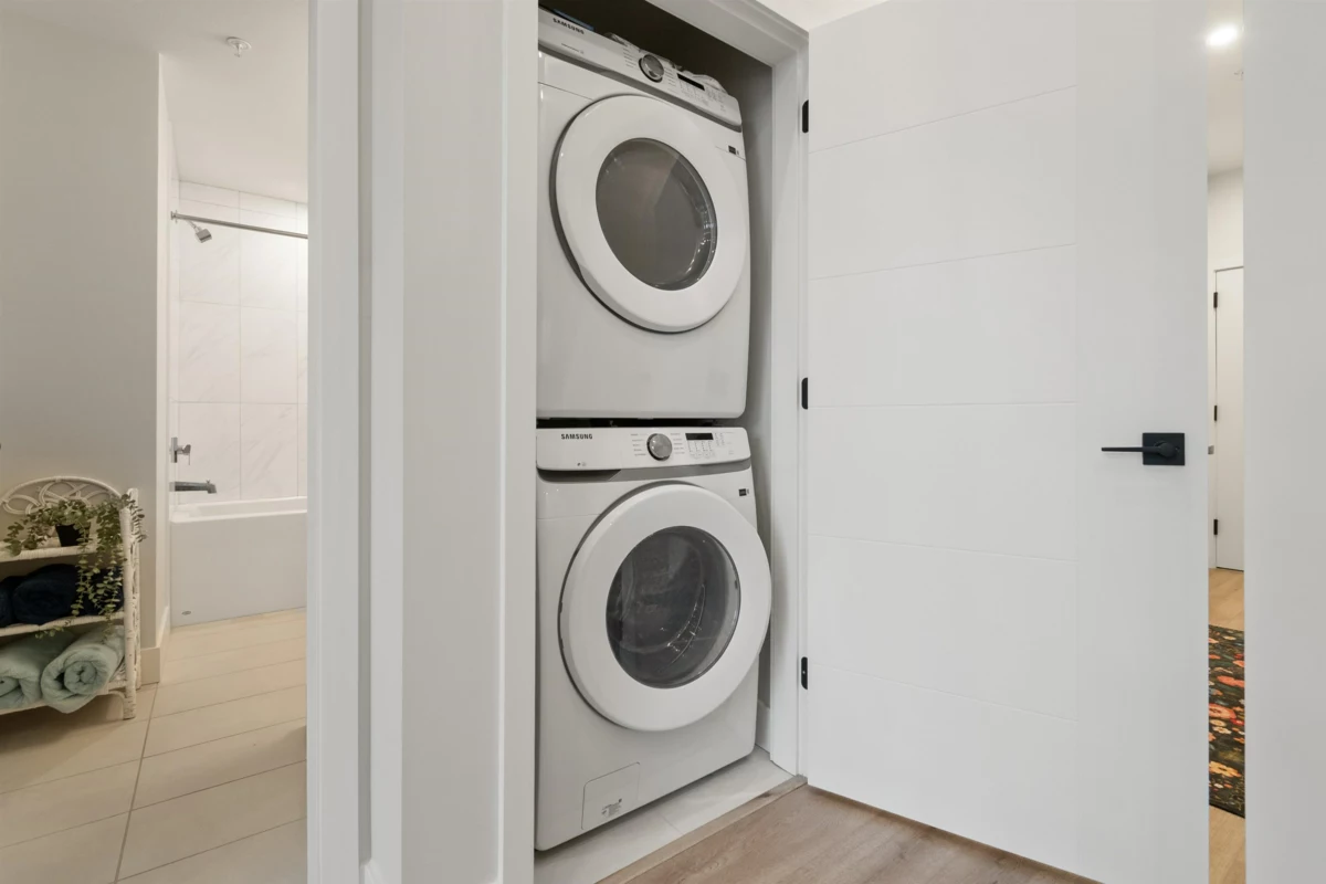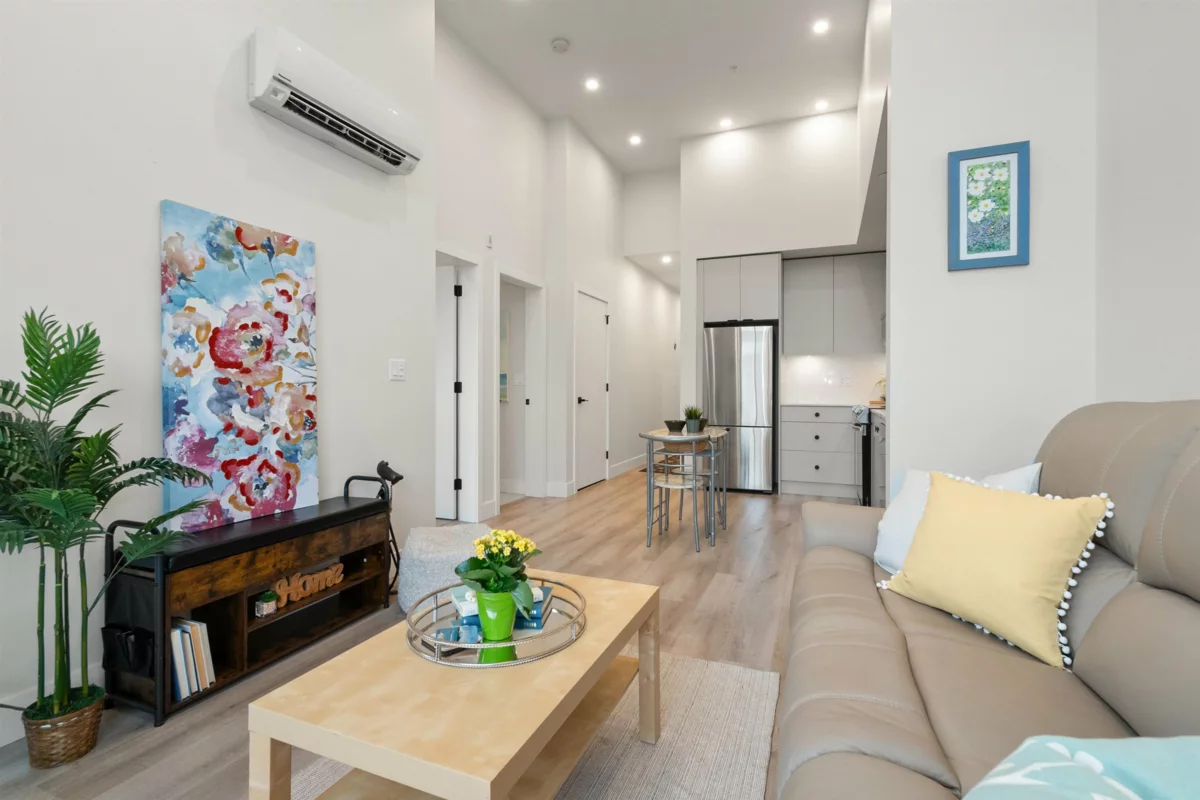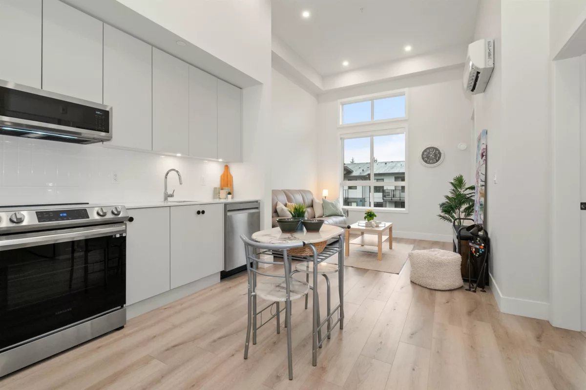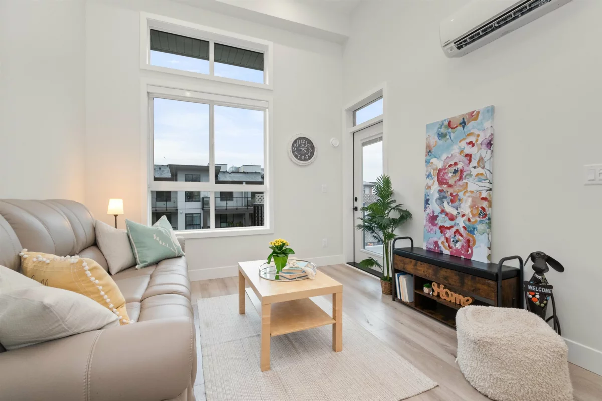 Discover an exceptional opportunity to own a top-floor, like-new one-bed + den condo in the highly sought-after Garrison Crossing community! This modern & airy home features soaring ceilings, abundant natural light, in-suite laundry, SS appliances, quartz counters, & 3 A/C heat pump units for year-round comfort in the Living Rm, Bdrm, & den. Spacious covered balcony with breathtaking mountain views. Secure underground parking and storage locker. Steps from vibrant shops, restaurants, and essential services, & a short stroll to the university and Vedder River Trail, this location offers the very best of lifestyle and walkability. Whether you're a first-time buyer, downsizer, or savvy investor, this home is an incredible chance to experience everything this thriving community has to offer!