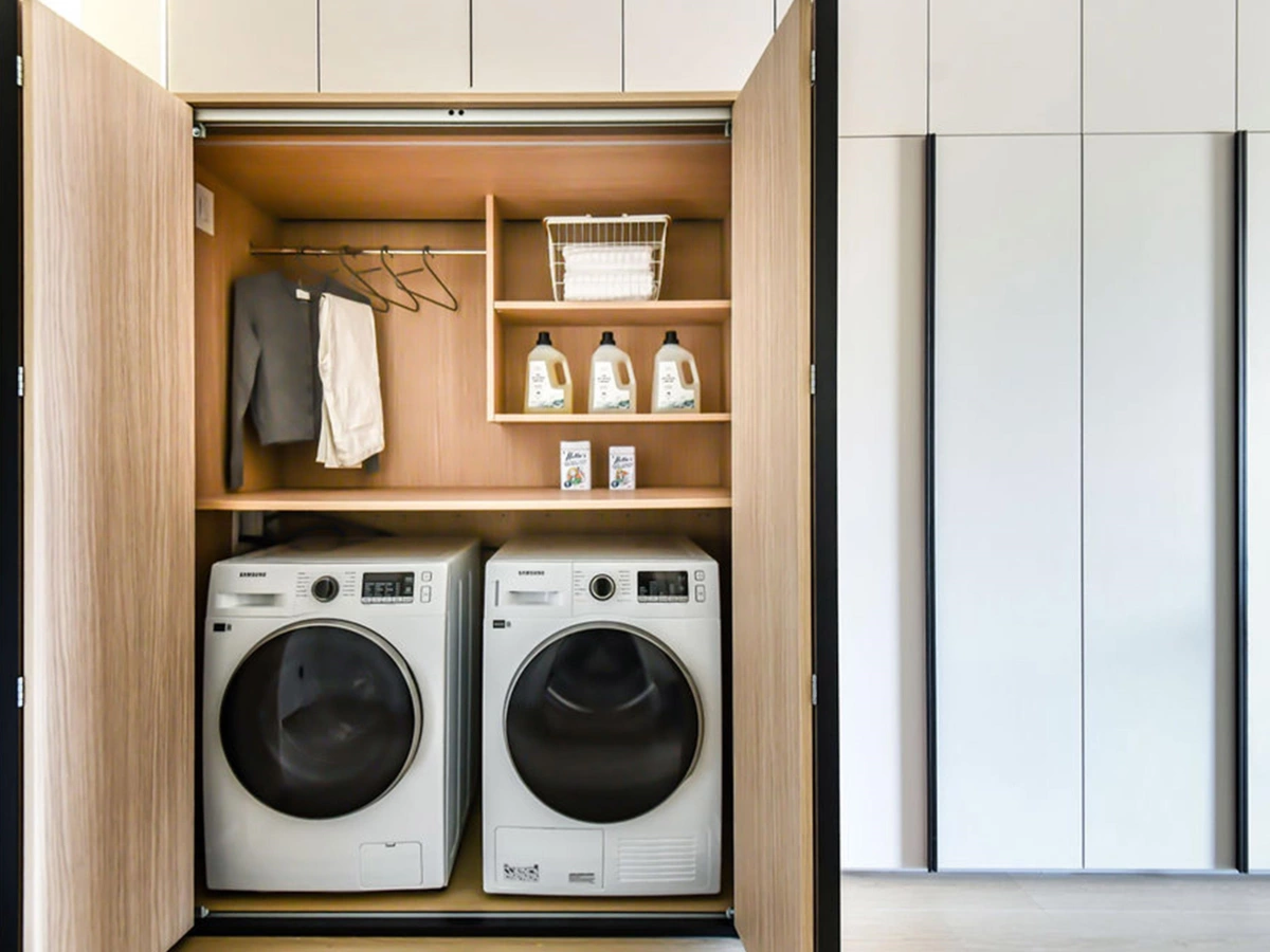DEVELOPER FINAL HOME. Discover hue by Marcon, a community nestled in Port Moody, surrounded by nature and complete with modern conveniences for contemporary living. Our 2-bedroom home features built-in TV millwork in the living room, creating a custom entertainment area, along with a built-in workspace ideal for working from home. A side-by-side washer and dryer, complete with integrated millwork, adds organization to your daily routine. The kitchen is equipped with a sleek, paneled Liebherr refrigerator, Fulgor Milano dishwasher, an AEG gas cooktop, and a built-in electric wall oven. The generous bathroom offers a deep soaking tub, providing a perfect place to unwind at the end of the day. Step out onto your private balcony facing the resident-only courtyard. Move-in ready.