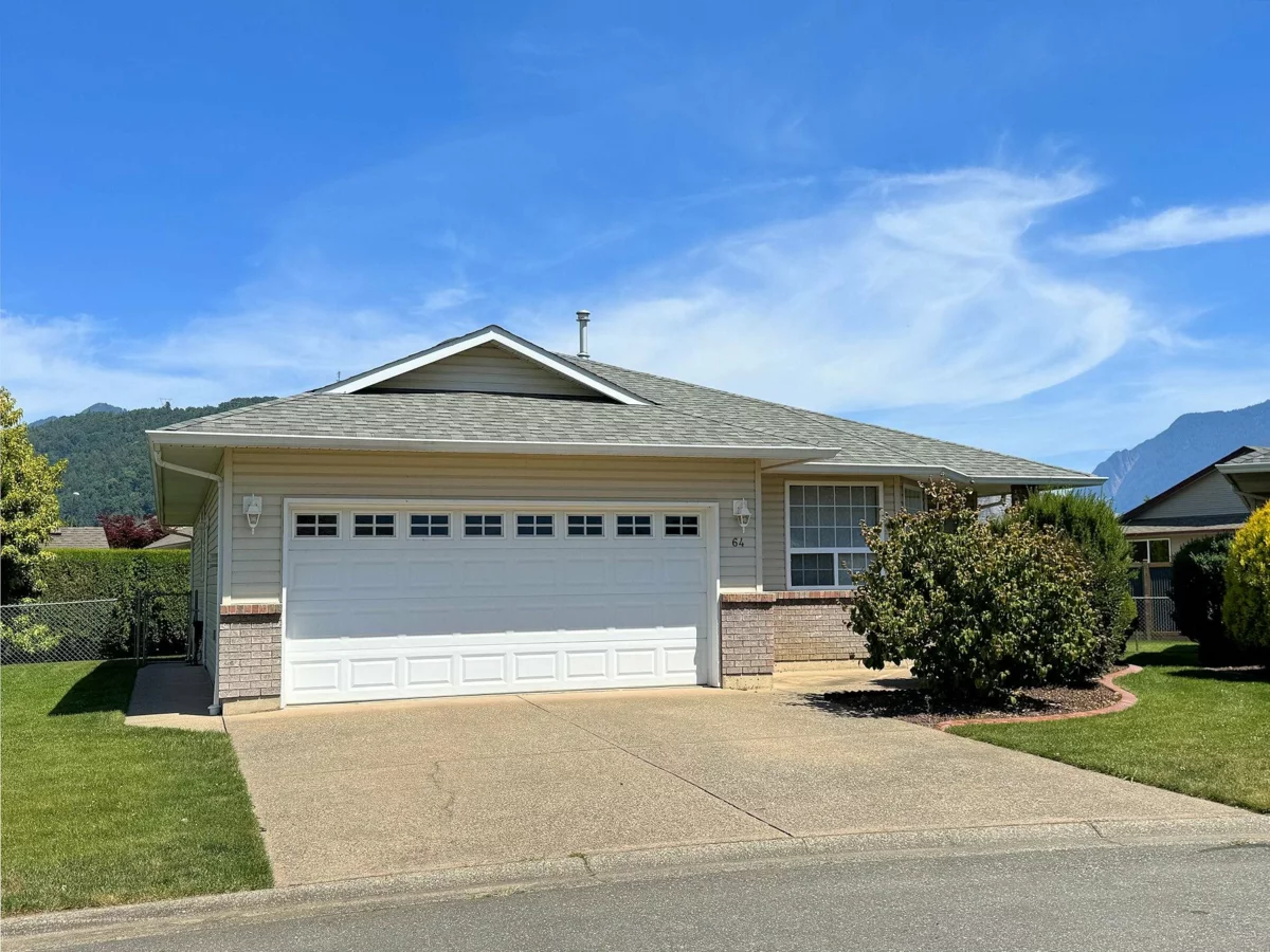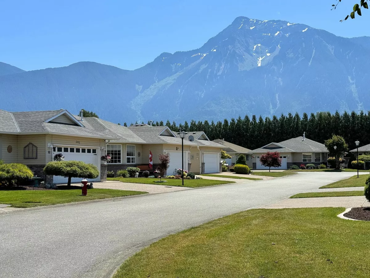 A superb retirement rancher in a lovely complex of detached homes on bare land strata. The view of Mt Cheam from your driveway is breathtaking. This home sits on a 6718 sq ft lot, perhaps the largest in the complex and nicely privatized with hedging, garden for pleasure or rest on your 12' x 8' covered deck. Inside, the home has lovely hardwood floors through most of the living area with ceramic tile in the high traffic zones. The main bedroom has a large walk-in closet and an ensuite with a 5' shower. The family room is huge and has the corner gas fireplace for warmth and a light tube! It's all on a 4' crawlspace with concrete floor, has all pex piping, central air-con, and a 21.5' deep double garage. A lovely age 55+ community in a serene, beautiful, setting, not too far from services.
