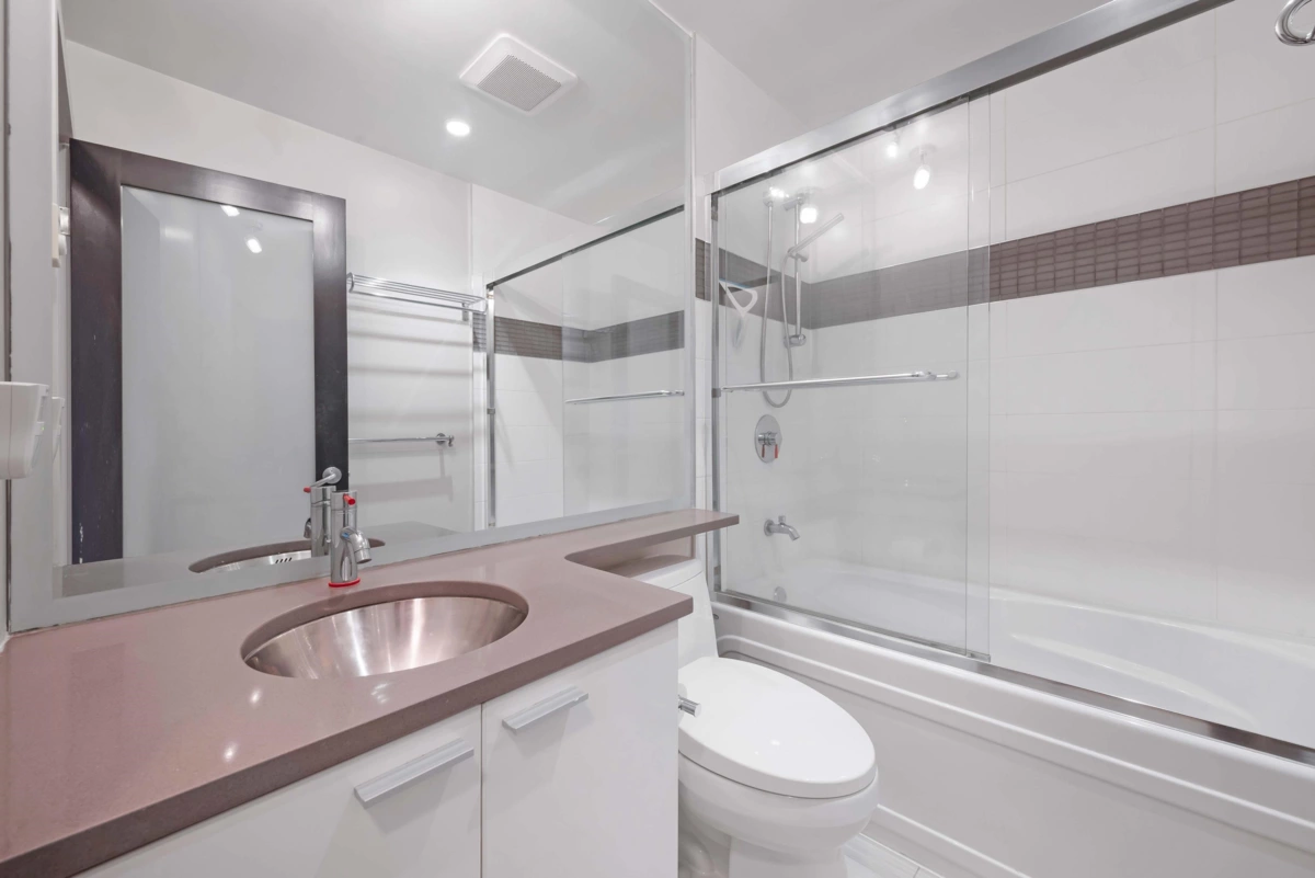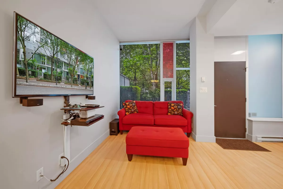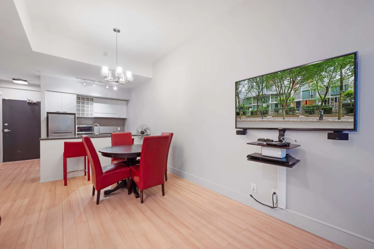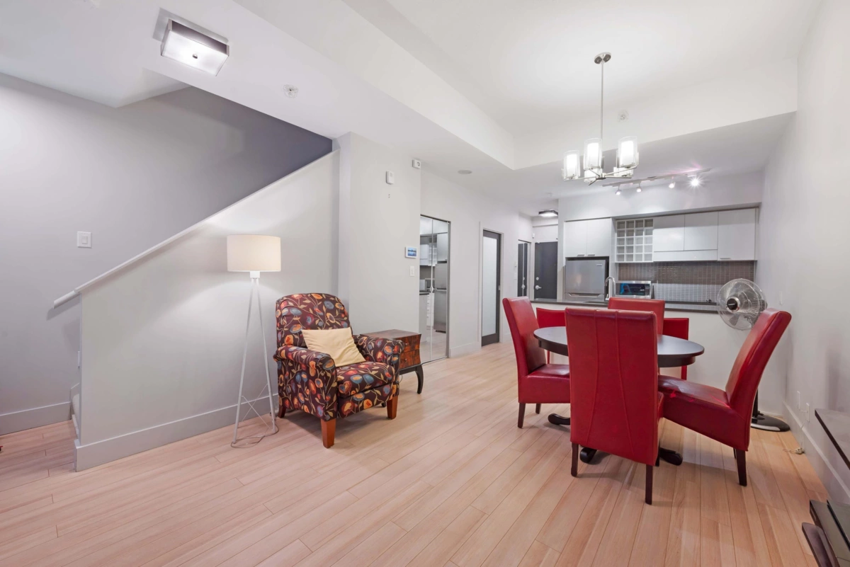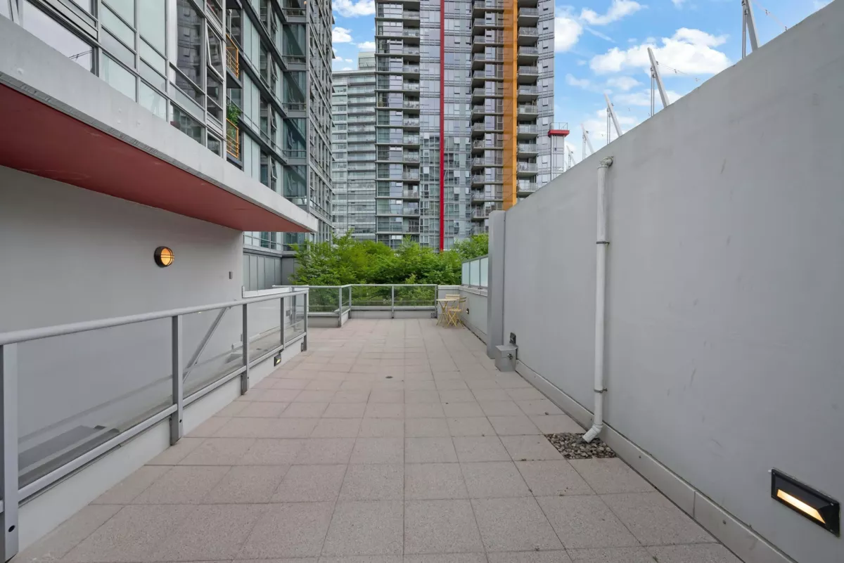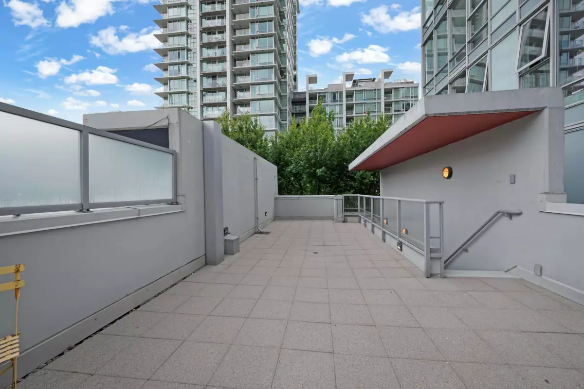 Welcome to this bright and contemporary townhome in the sought-after Spectrum community. This spacious home offers 2 well-appointed bedrooms, a versatile den ideal for a home office or nursery, and 2 bathrooms, including a main floor powder room and a sleek 3-piece upstairs. The open-concept living and dining area flows into a modern kitchen, perfect for everyday living and entertaining. Step out to your private rooftop patio, ideal for relaxing or hosting. Solid concrete construction ensures long-term durability and quiet comfort. Enjoy premium amenities including an indoor pool, fitness centre, hot tub, sauna, and concierge, all just steps from SkyTrain, shopping, dining, and the energy of downtown Vancouver.