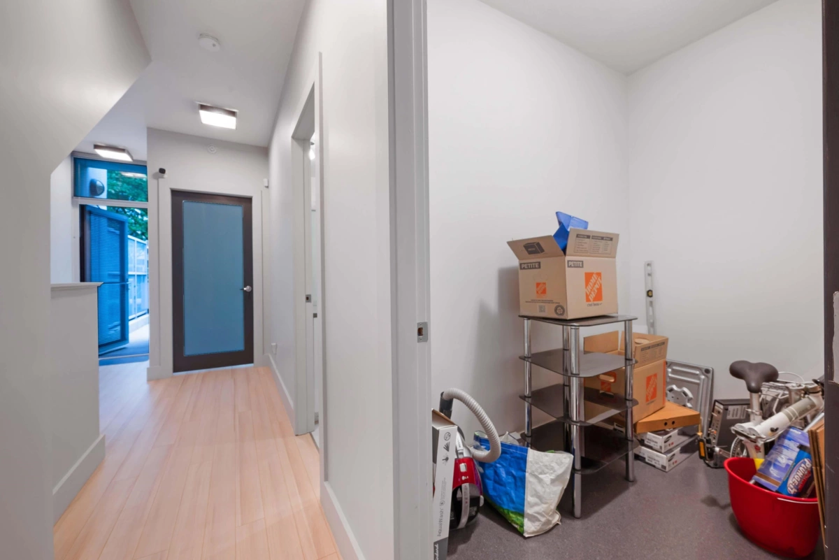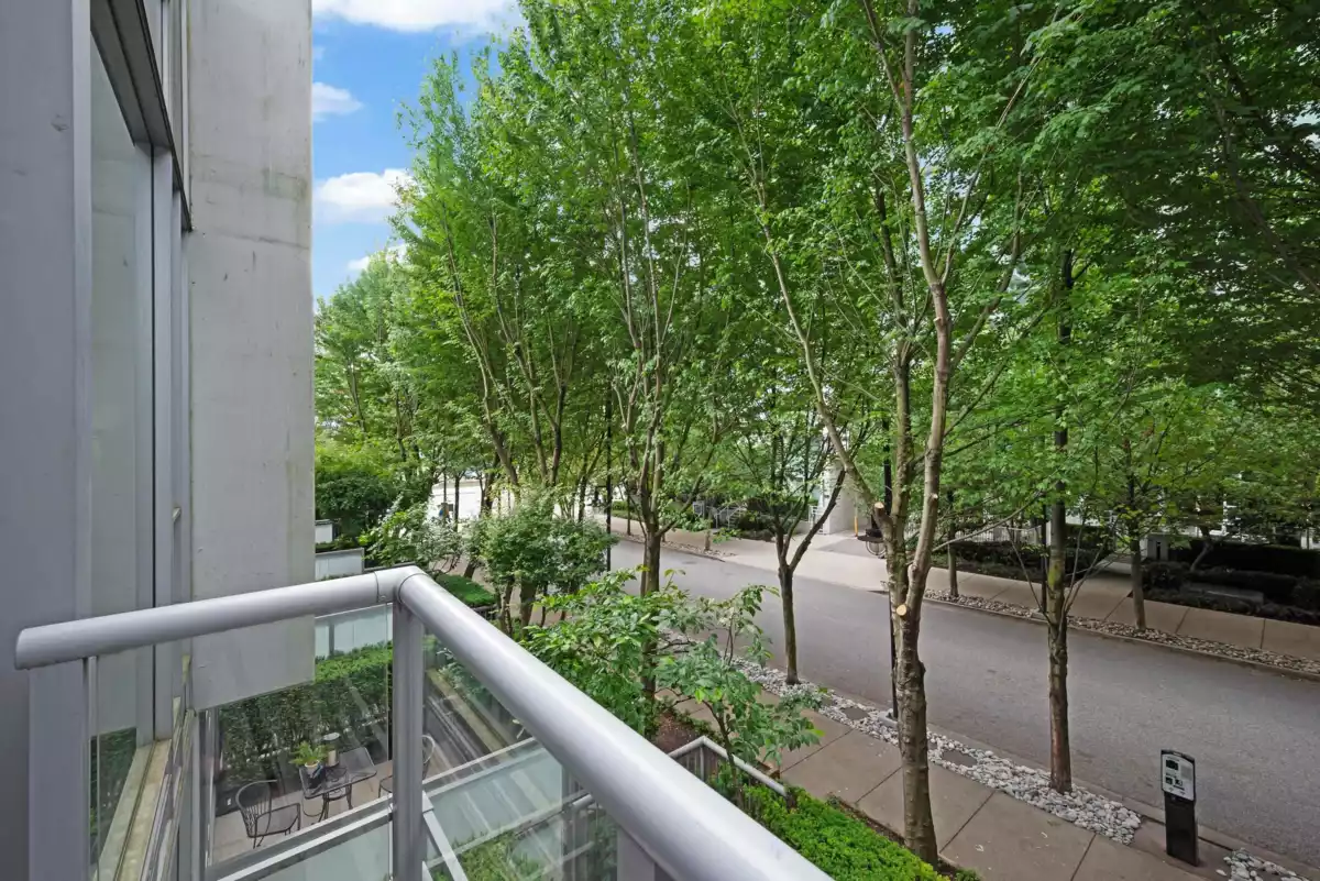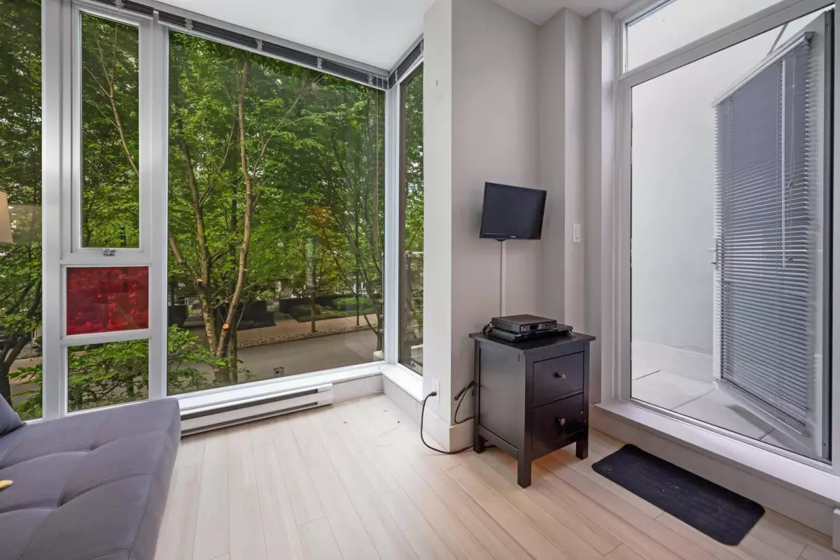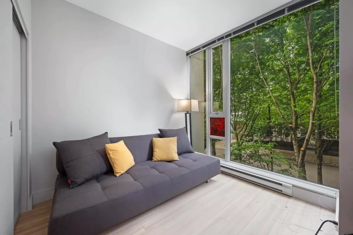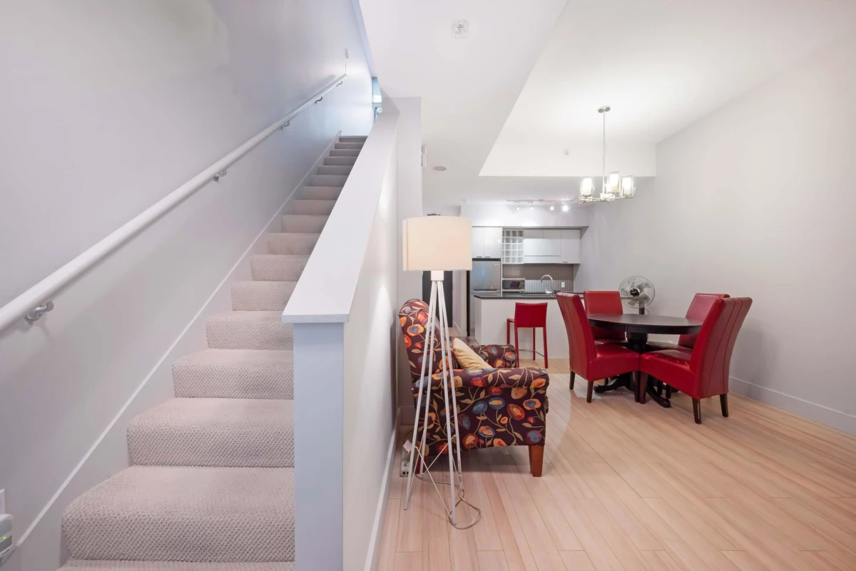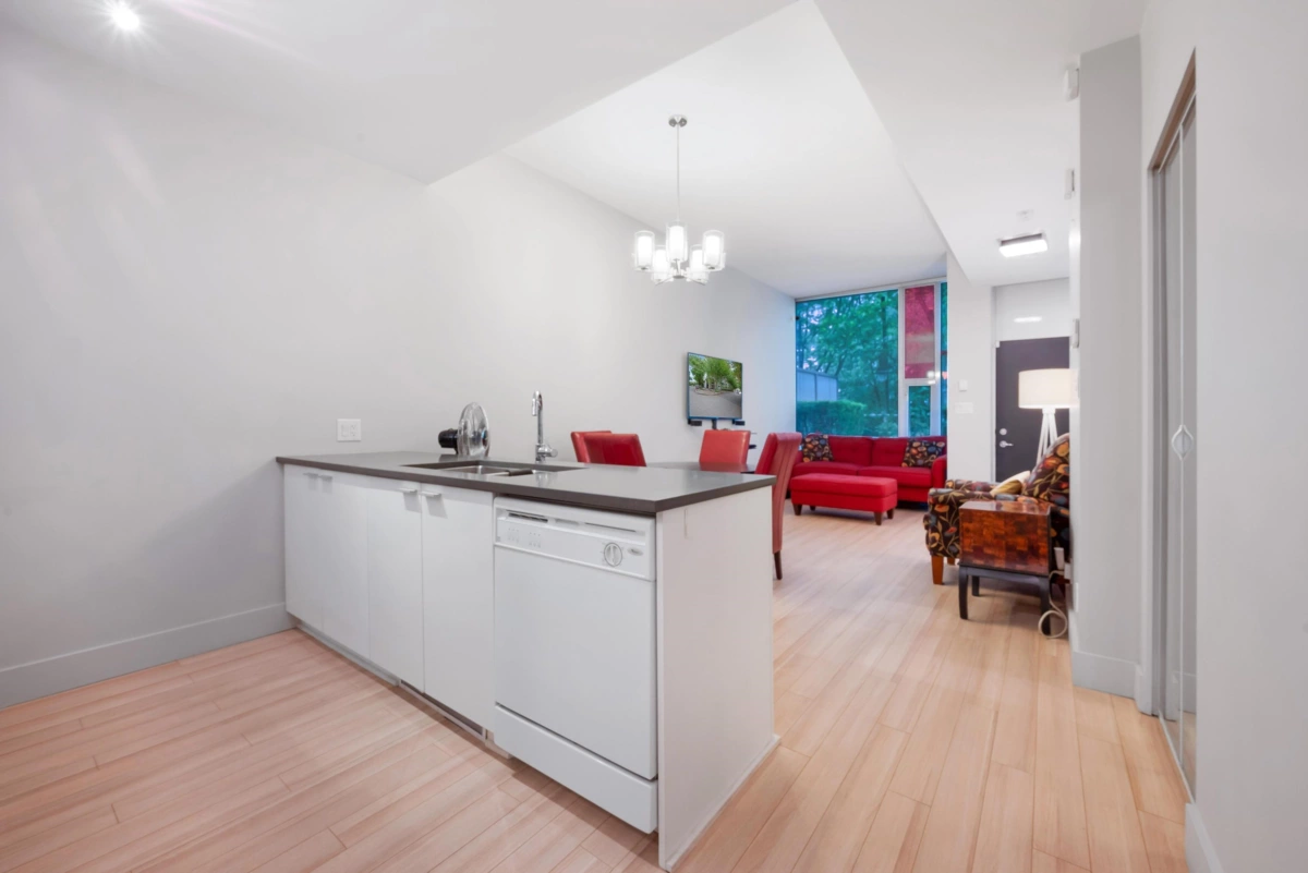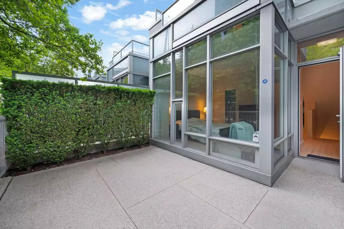 Welcome to this bright and contemporary townhome in the sought-after Spectrum community. This spacious home offers 2 well-appointed bedrooms, a versatile den ideal for a home office or nursery, and 2 bathrooms, including a main floor powder room and a sleek 3-piece upstairs. The open-concept living and dining area flows into a modern kitchen, perfect for everyday living and entertaining. Step out to your private rooftop patio, ideal for relaxing or hosting. Solid concrete construction ensures long-term durability and quiet comfort. Enjoy premium amenities including an indoor pool, fitness centre, hot tub, sauna, and concierge, all just steps from SkyTrain, shopping, dining, and the energy of downtown Vancouver.