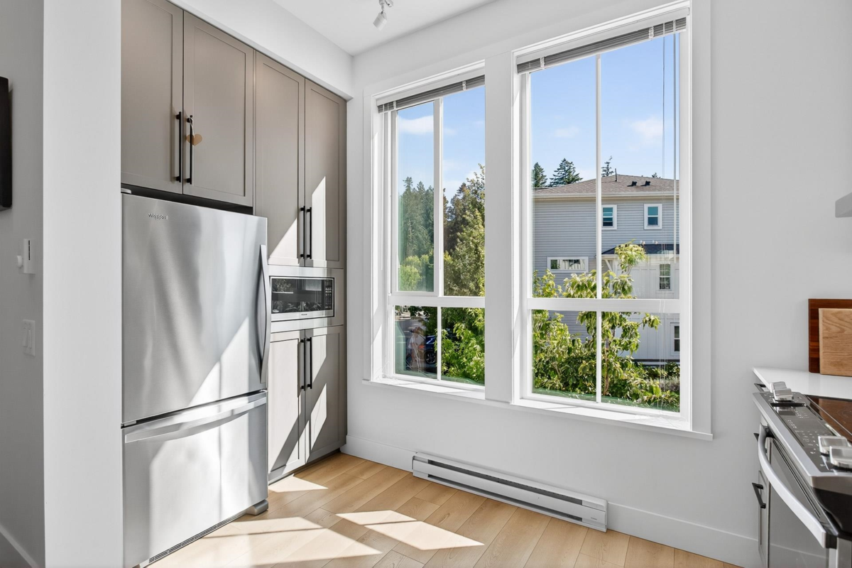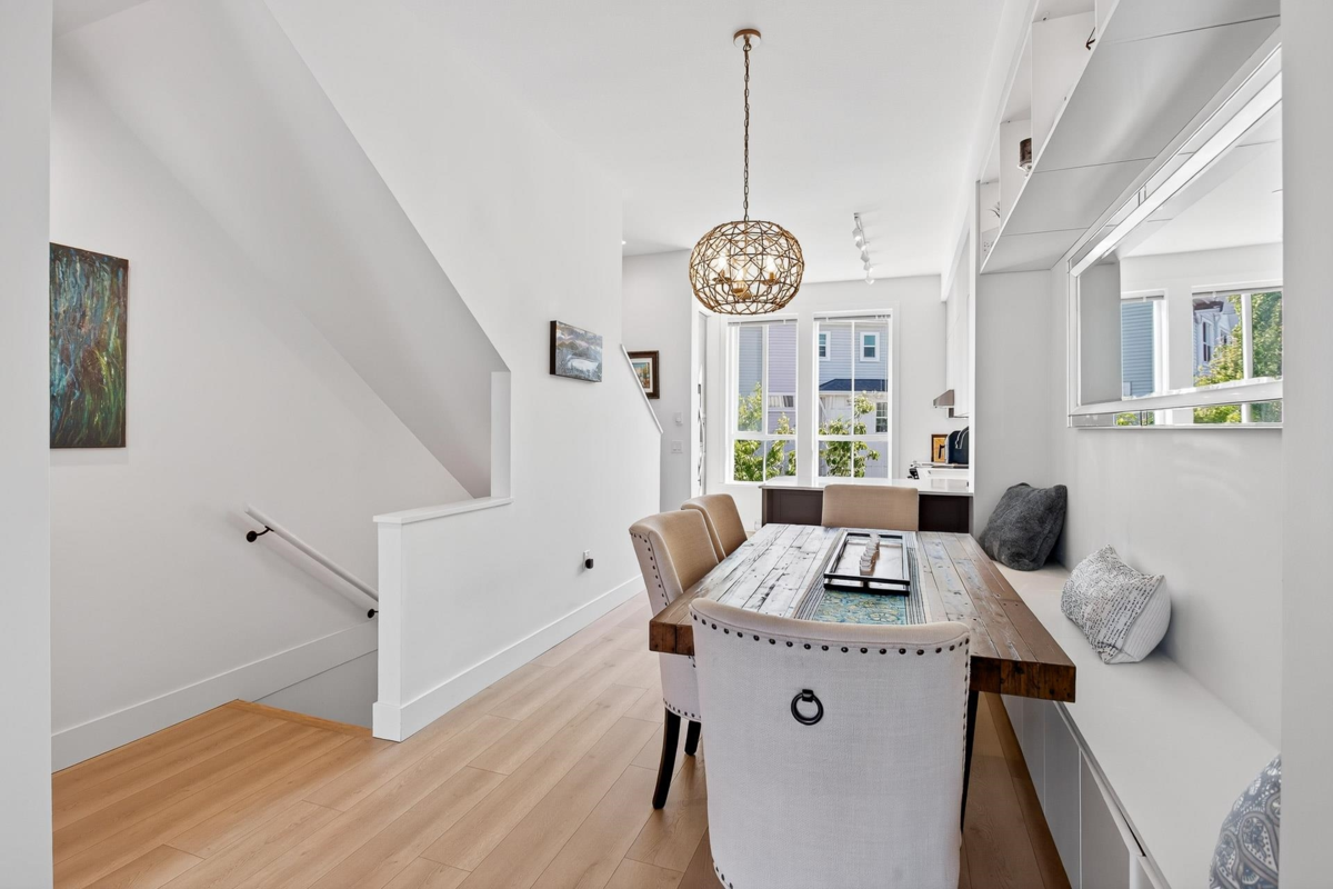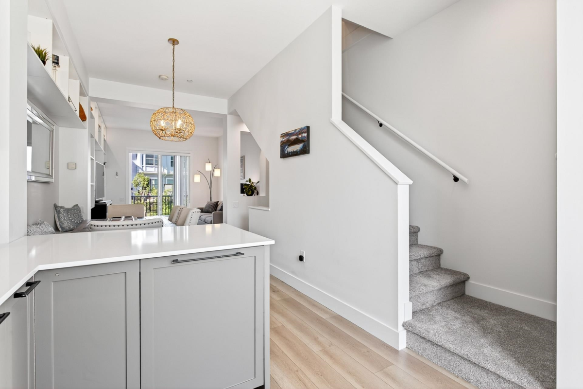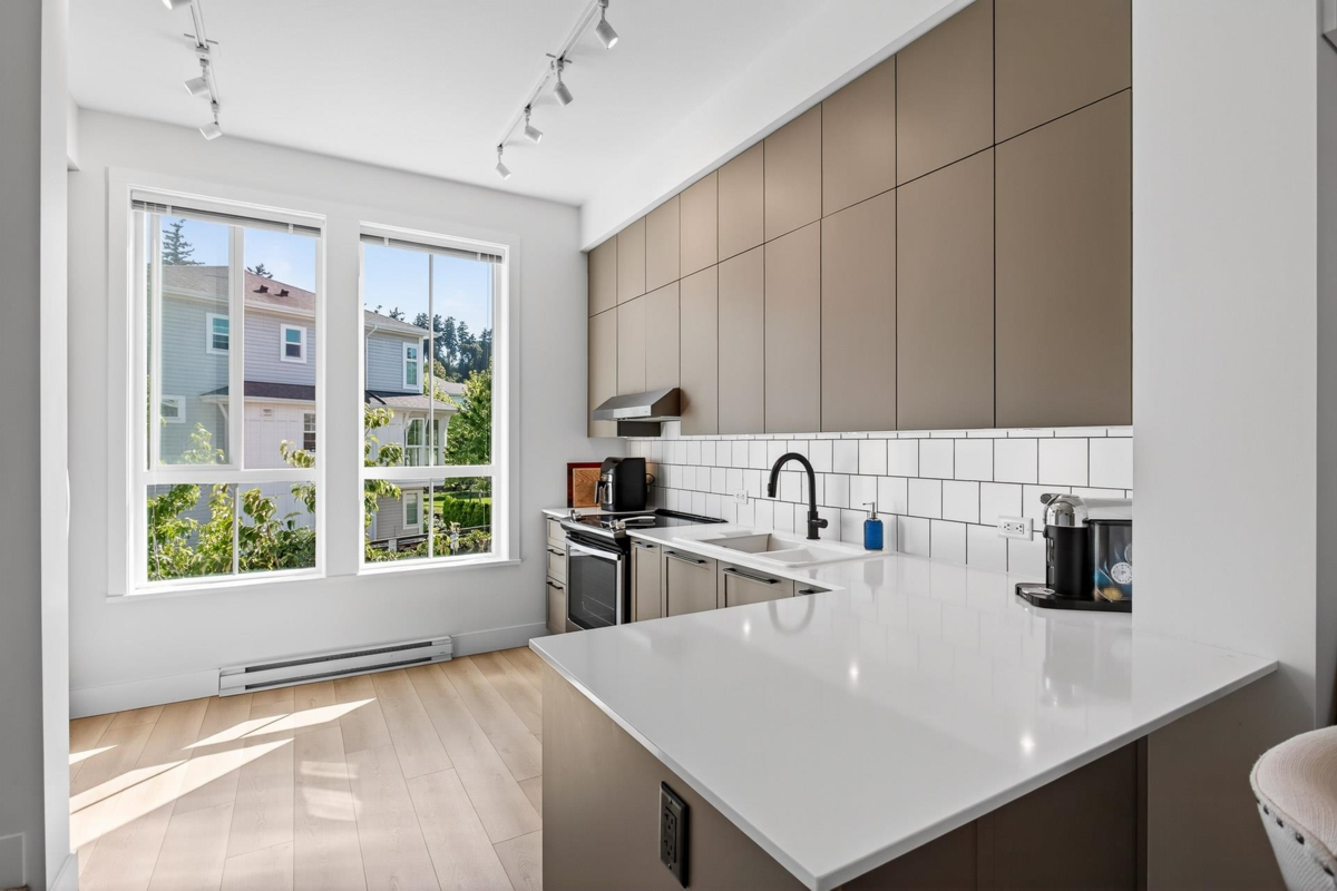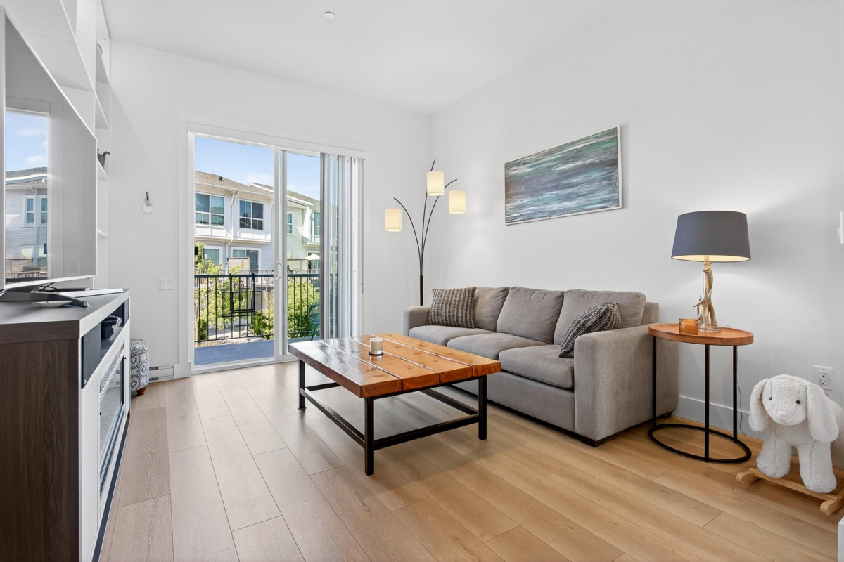 Welcome to this beautifully updated home in a great location in the highly sought-after Seaside community! Recent renovations include new carpets, custom built-in cabinets in the dining & living rooms, & closet organizers. Featuring an open concept floorplan, 10ft ceilings, & large sunny windows throughout. The stunning kitchen showcases stainless appliances, quartz counters, ample pantry storage, & under-cabinet lighting. Upstairs you'll find 2 generous bedrooms & 2 full baths, while the entry level includes a versatile den, powder room, & a garage with plenty of storage. The complex has great amenities including a pool, gym, & games room; plus close proximity to schools, beaches, & shopping. Quick possession is possible. Open House Saturday Nov 29th, 2-4pm!