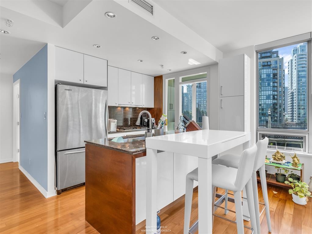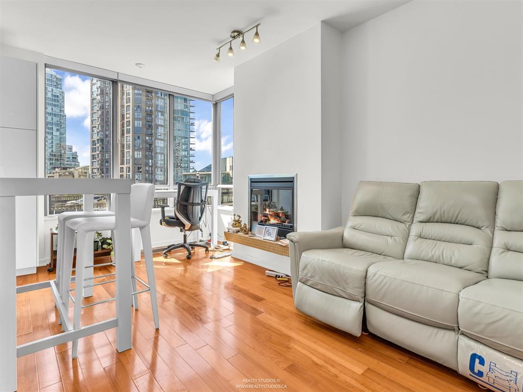 Welcome to The Alvar by Concert Properties! This beautiful 1 bed + den home features a functional kitchen with granite countertops, stainless steel appliances, gas range stove, and island with bar seating And in unit Heat Pump providing comfort of Air conditioning in the summer and heat in the winter. Just off the kitchen is an airy and bright living space with 9 ft ceilings and an electric fireplace. Conveniently located in the West End near shopping, restaurants, and steps from the Seawall. Enjoy the amenities: fitness centre, whirlpool hot tub, lounge with outdoor patio, and BBQ. Comes with 1 parking & 1 storage. Call to book your showing! Open House Saturday October 18th from 2-4pm.