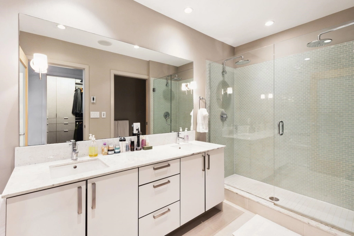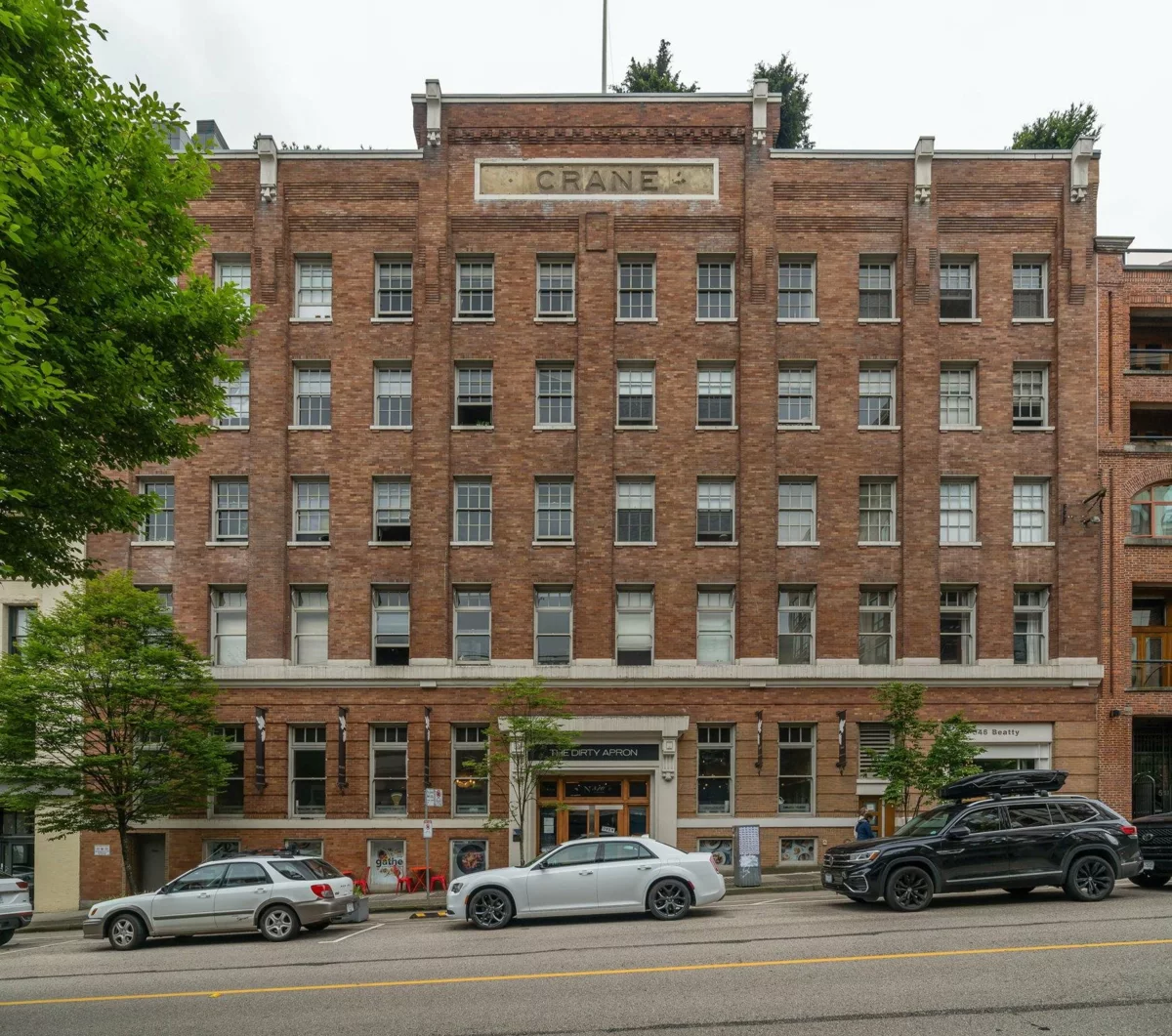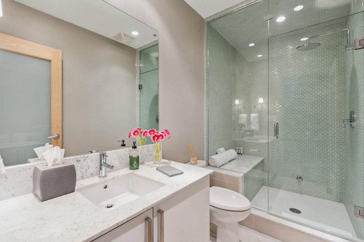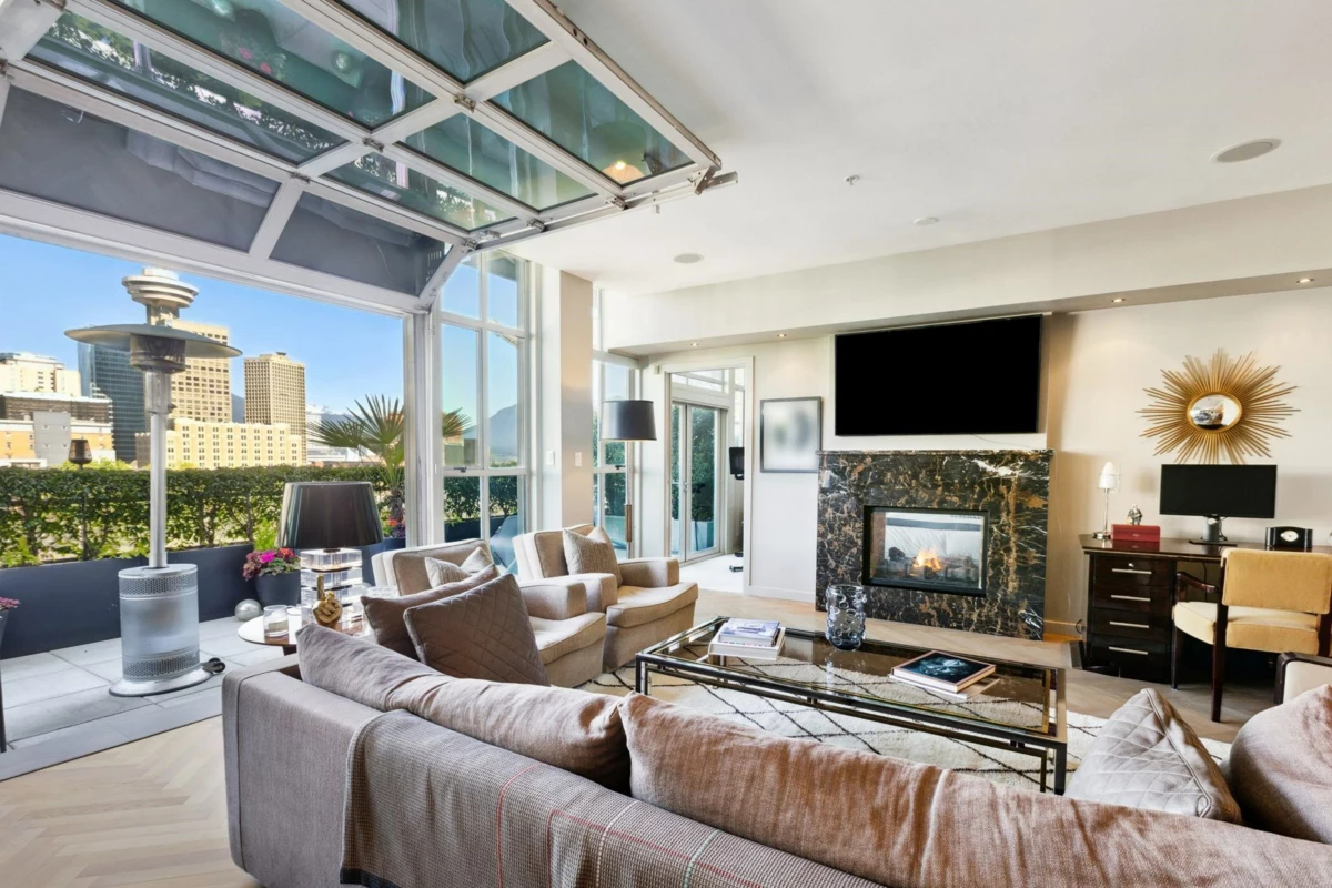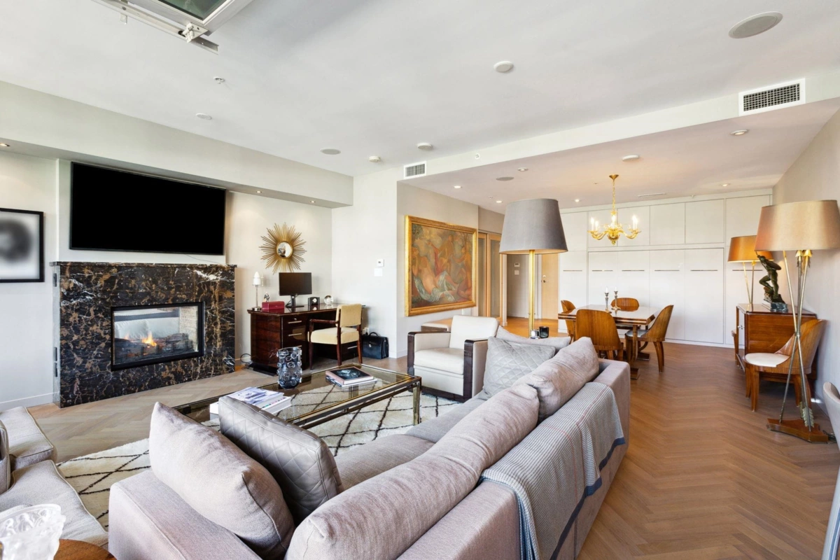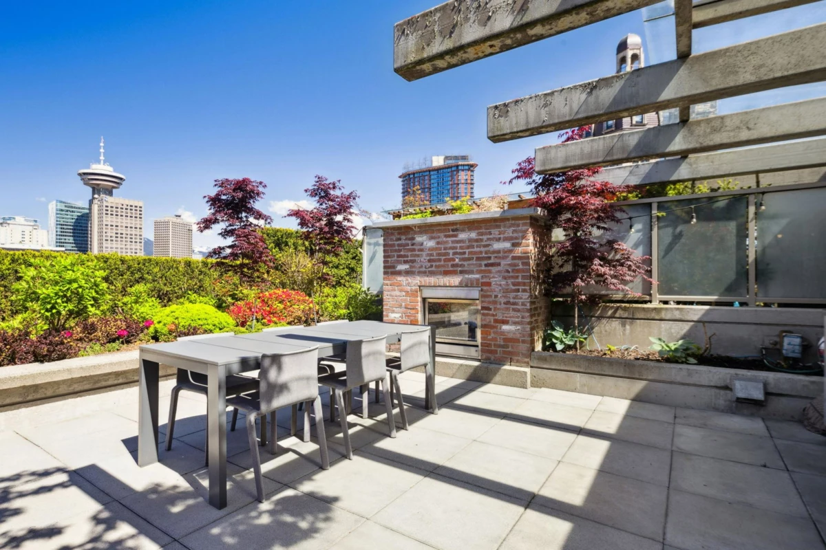 Experience elevated indoor-outdoor living at The Crane. This renovated sanctuary features a gourmet kitchen with Gaggenau/Subzero appliances, custom cabinetry, granite counters, and a wine fridge. A garage-style door opens to 300+ sq ft of patio space. Inside, herringbone oak floors and a Murphy bed offer style and flexibility. The second bath includes a steam shower, while the spacious primary boasts a marble fireplace and spa-like ensuite with soaker tub and marble finishes. The 600+ sq ft rooftop patio offers stunning North Shore and downtown views.