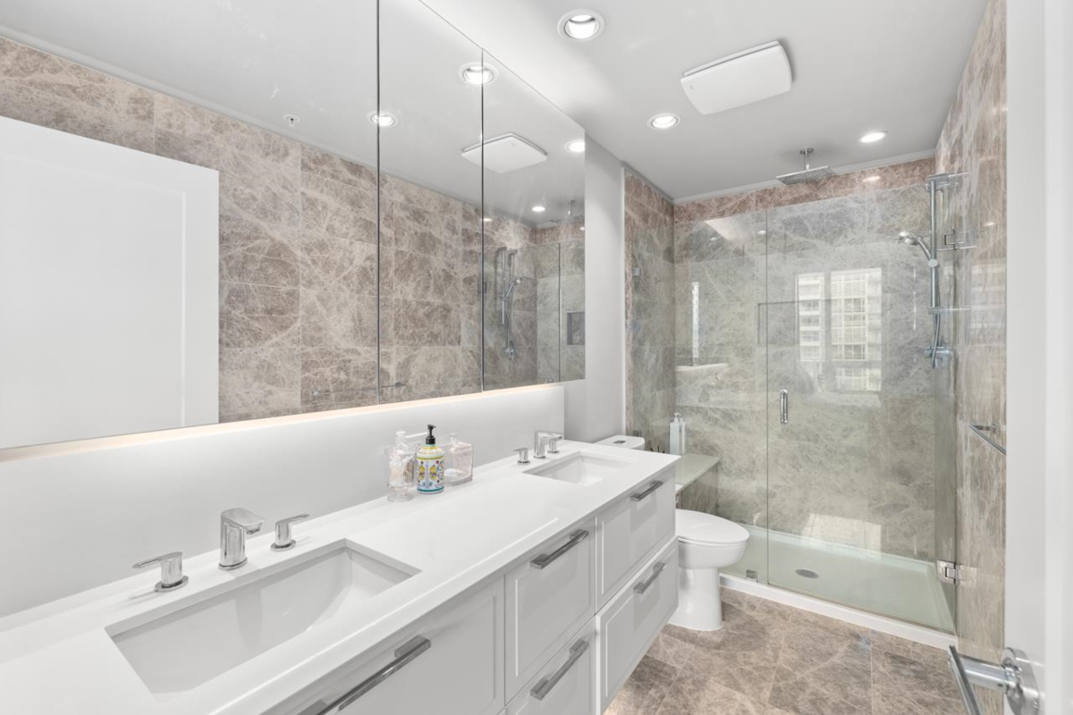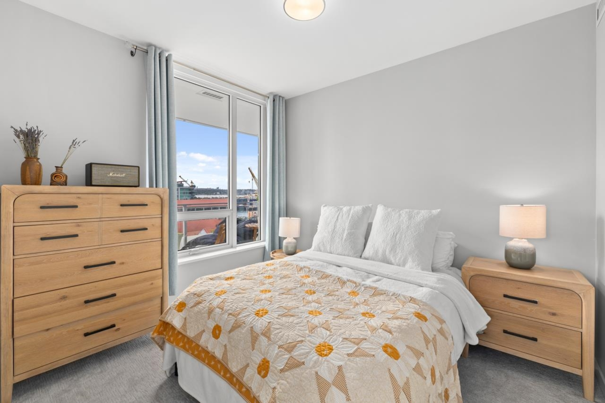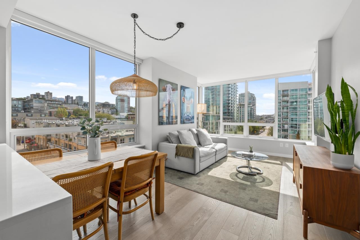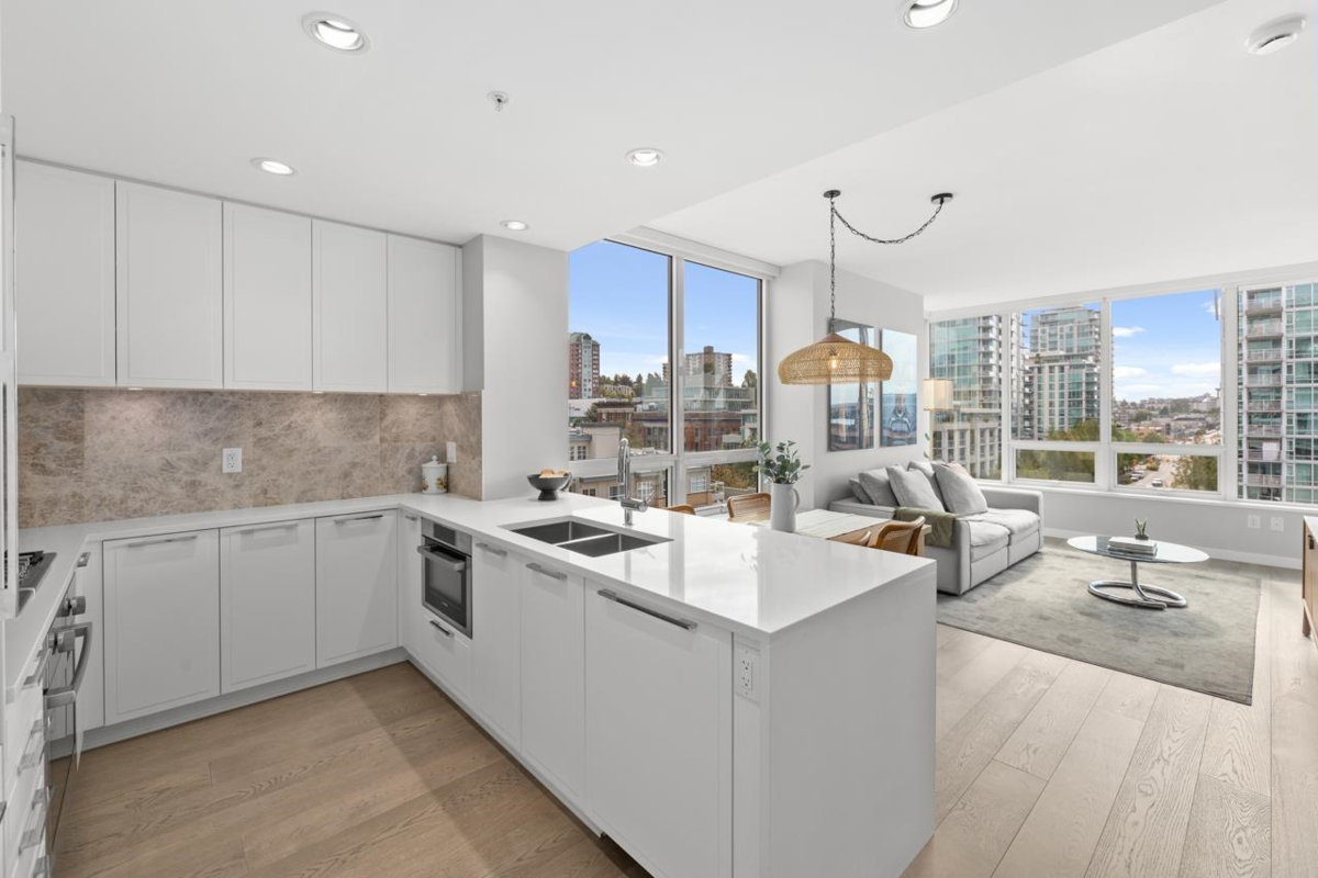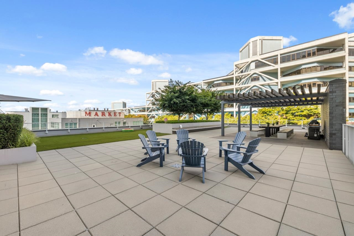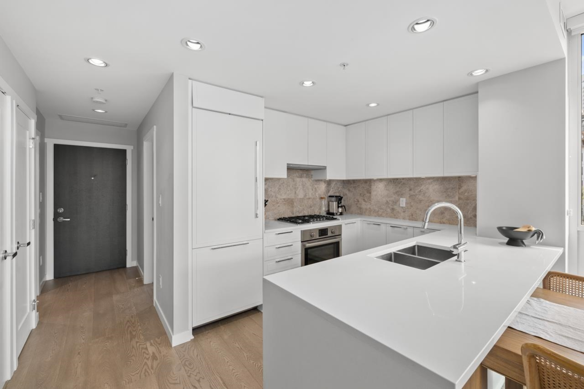 Welcome to this sophisticated 2 bed, 2 bath view home in Promenade at The Quay. This BRIGHT CORNER HOME features PANORAMIC OCEAN, CITY & MOUNTAIN VIEWS and a thoughtfully designed layout with an abundance of natural light. The GOURMET KITCHEN features integrated Bosch appliances, GAST STOVE and a large breakfast bar that opens up the living area, making it perfect for entertaining. The primary suite features a SPA-LIKE ENSUITE and WALK-IN CLOSET. The OVERSIZED COVERED PATIO is ideal for unwinding and enjoying the harbour views. Built by award-winning Polygon, this LUXURY CONCRETE BUILDING is just six years old and features AC, and hotel-like AMENITIES including concierge, gym, party room, outdoor lounge, and a dog wash station. Includes one parking.