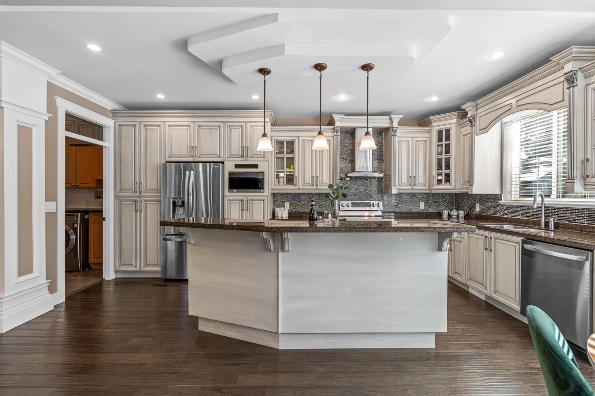 Located on a quiet street in Willoughby, this well-kept 6 bdrm&4 bath home offers a spacious, functional layout well-suited for modern family living with space for every need. The main floor features a dramatic great room with soaring ceilings, a bright home office with French doors, formal dining area, and a warm kitchen with antique cabinetry, granite counters, and hickory hardwood floors. Upstairs is a generous primary suite with vaulted ceilings, a spa-like ensuite, and three more bedrooms. The basement includes a bright 2 bdrm with a large rec room and separate entry—great for extended family or rental income. Enjoy a west-facing landscaped yard, double garage, and proximity to schools, parks, shops, and future SkyTrain.