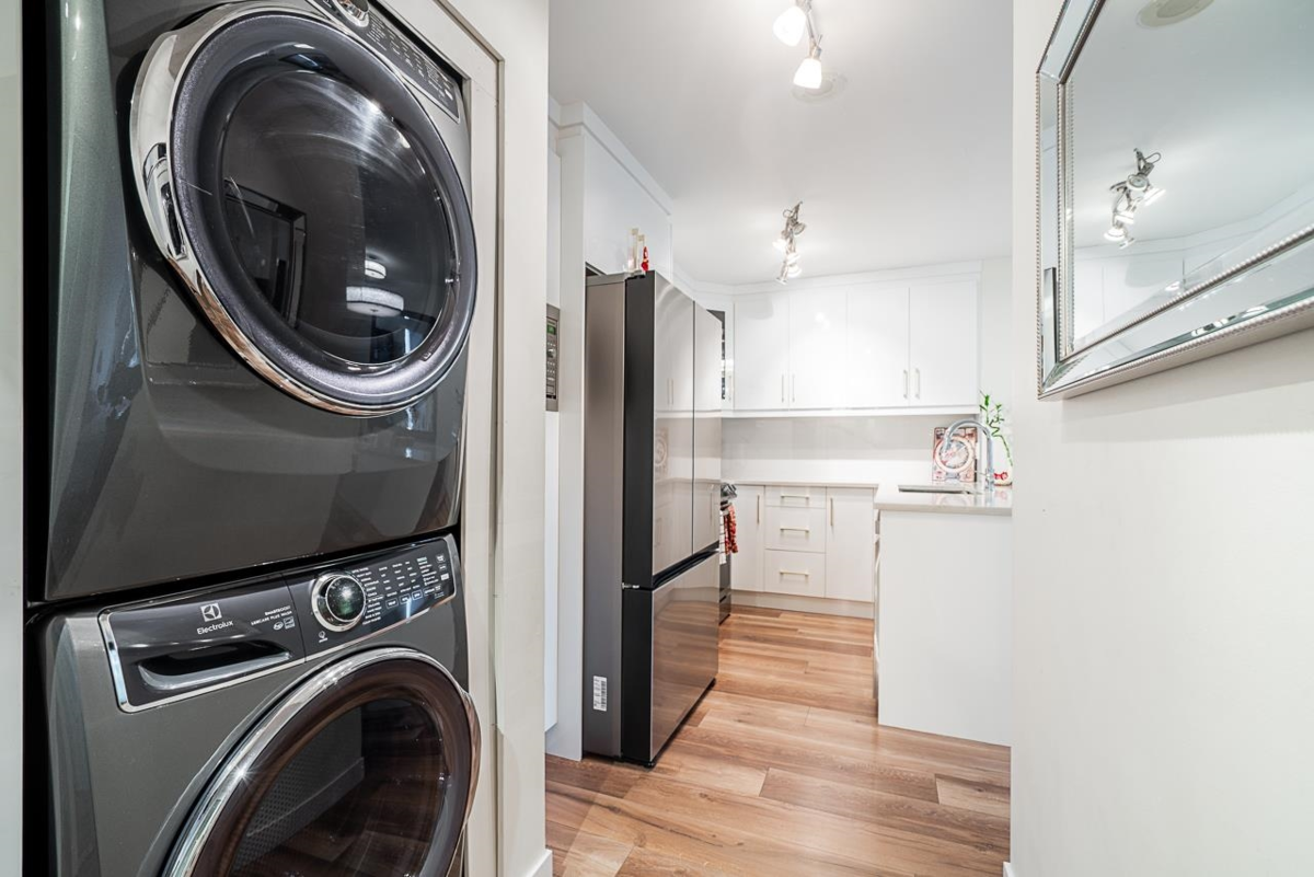 Beautifully RENOVATED in 2022. This condo can be accessed through a PRIVATE DRIVEWAY, tucked away from the main road for extra comfort and security. A part of "The River Dance" building, situated in the sought-after River District, steps away from the Riverfront Park, Golf Course, and Tennis Courts. This 2 BED and 2 BATH condo offers an eastern view of the river with a functional layout containing IN-SUITE LAUNDRY. It has a GAS FIREPLACE, comes with 2 side by side parking stalls, and a storage locker.