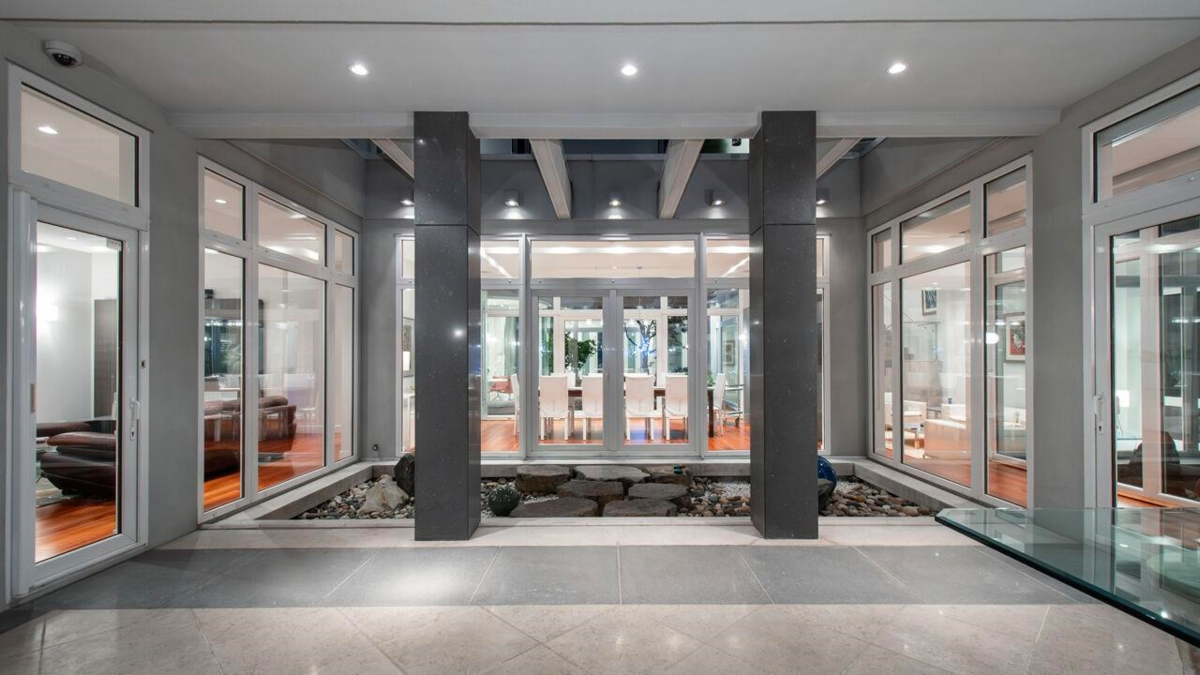 This custom-built, one-owner home offers luxurious living on just two levels, ideal for entertaining. The gated driveway leads to a 4-car garage and a stunning front courtyard with limestone tiles. Inside, cherry wood floors and limestone accents enhance elegant drywall detailing. The open center courtyard and large covered patio, equipped with gas outdoor heaters and fountains, provide seamless indoor-outdoor flow. Comfort abounds with radiant in-floor heating, dual A/C, and 21 security cameras. Features include an elevator, steam shower, hot tub, two gas fireplaces, and custom blinds—some automatic. The gourmet kitchen boasts a Sub-Zero fridge, Miele induction cooktop, oven, and dishwasher. With 6 bedrooms, an office, and Euro line windows, this home defines refined, spacious living.