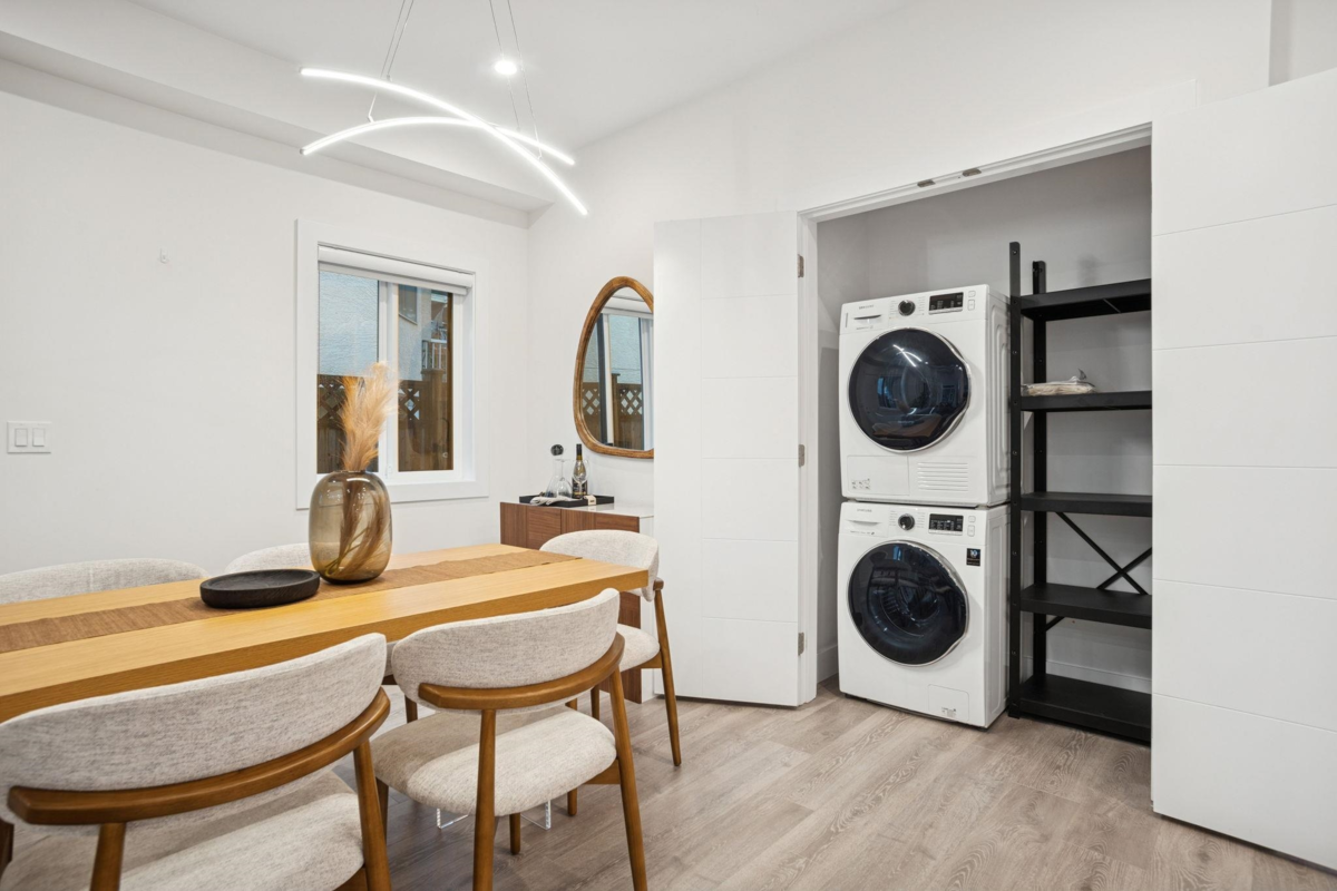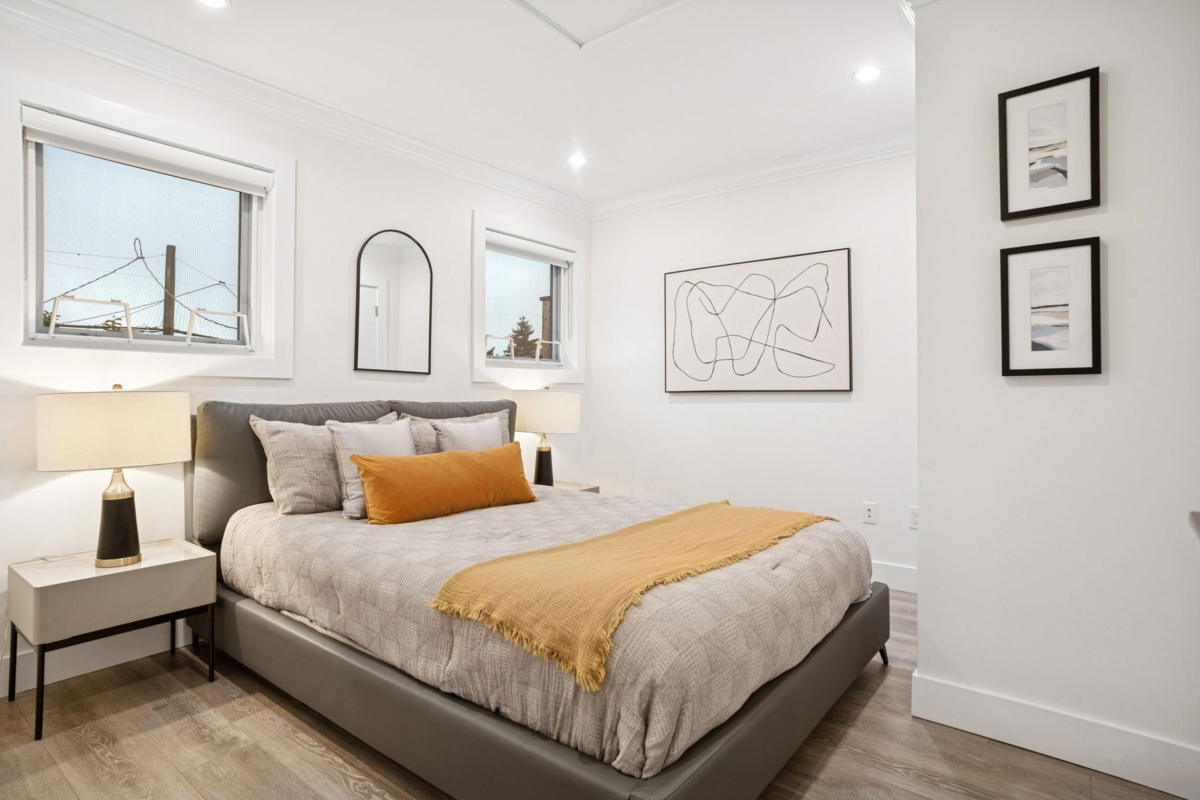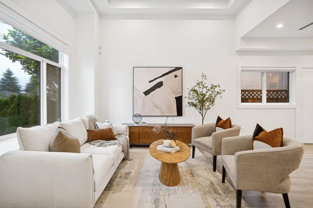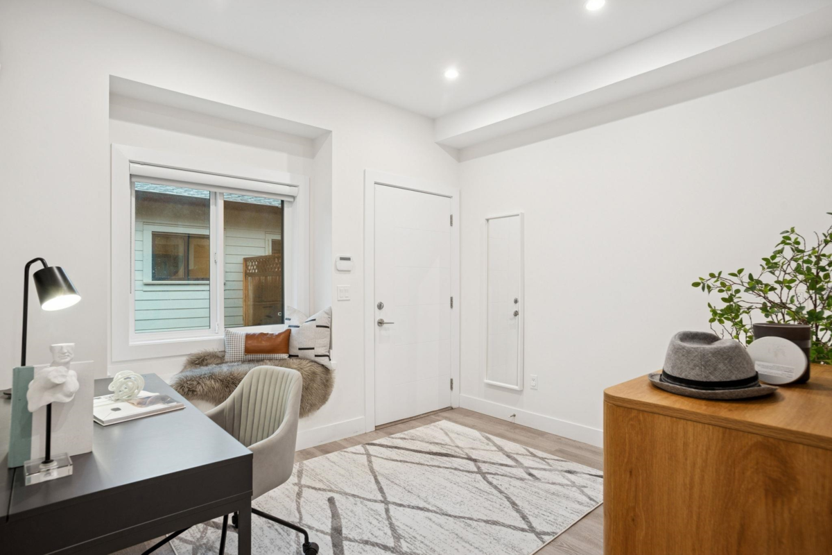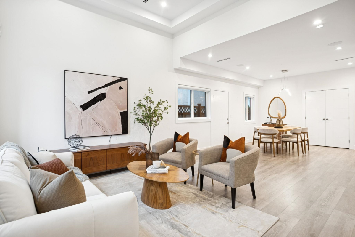 Well-designed 4 bed/4 bath modern duplex blends comfort, style, and function. Bright main living area features over-height ceilings and large windows that invite natural light. A well-equipped kitchen with quality appliances offers space for daily cooking and entertaining, while spa-inspired bathrooms add a relaxing touch. Stay comfortable year-round with radiant in-floor heating and A/C. Smart home features include built-in speakers, central vacuum, and a security camera system. The flexible main floor layout includes a bedroom, den, and full bath with separate entrance—ideal for a mortgage helper or in-law suite. Enjoy a fenced yard, single garage, and extra parking. Conveniently located within walking distance to local parks, community amenities, Highgate Shopping, top-ranked schools.