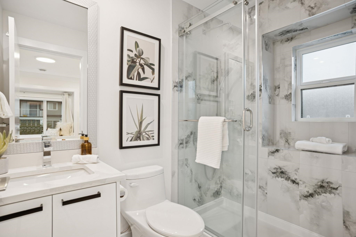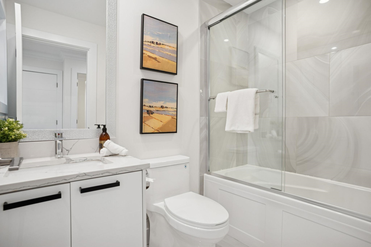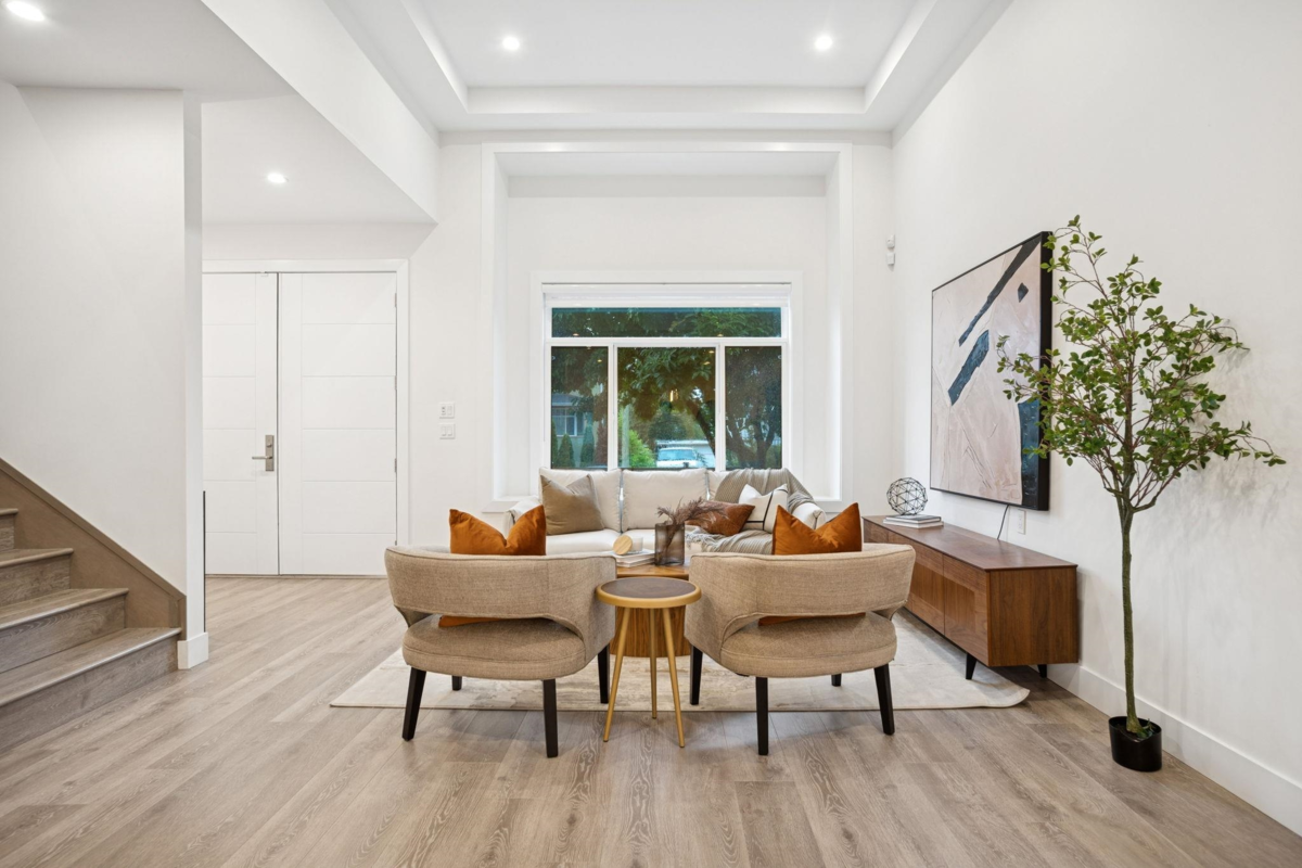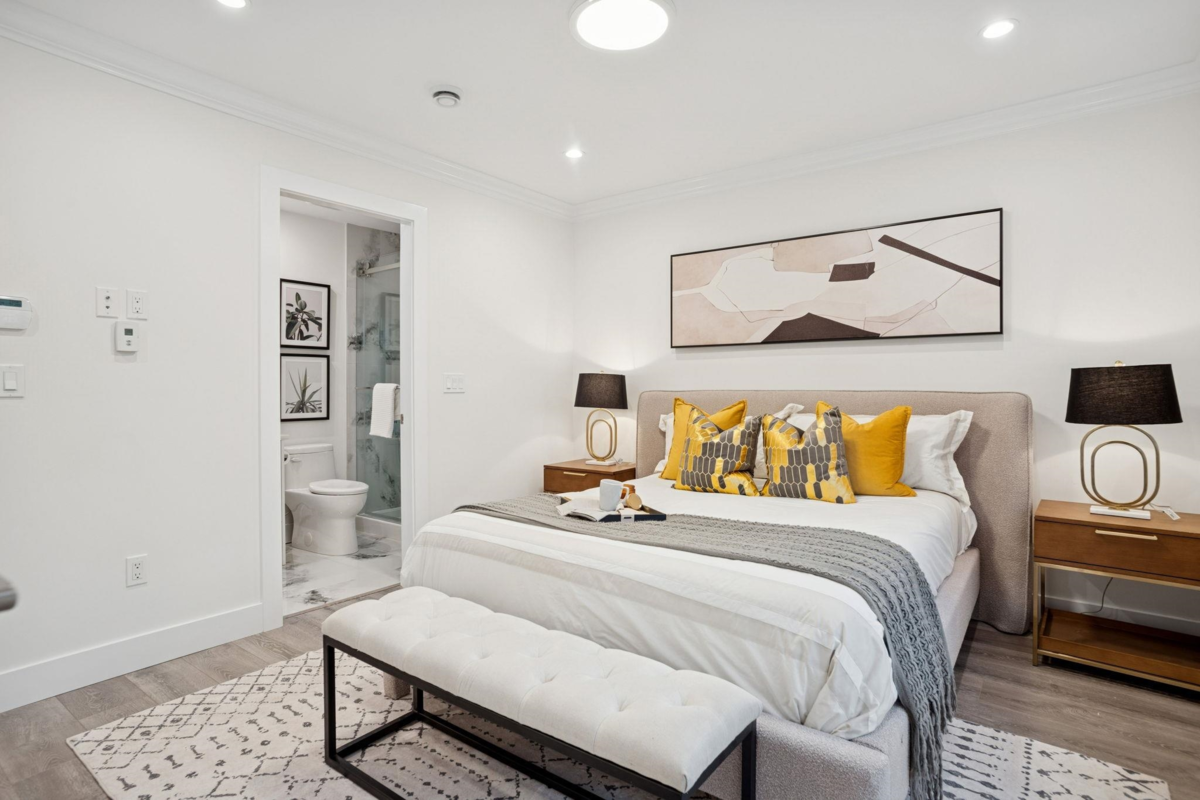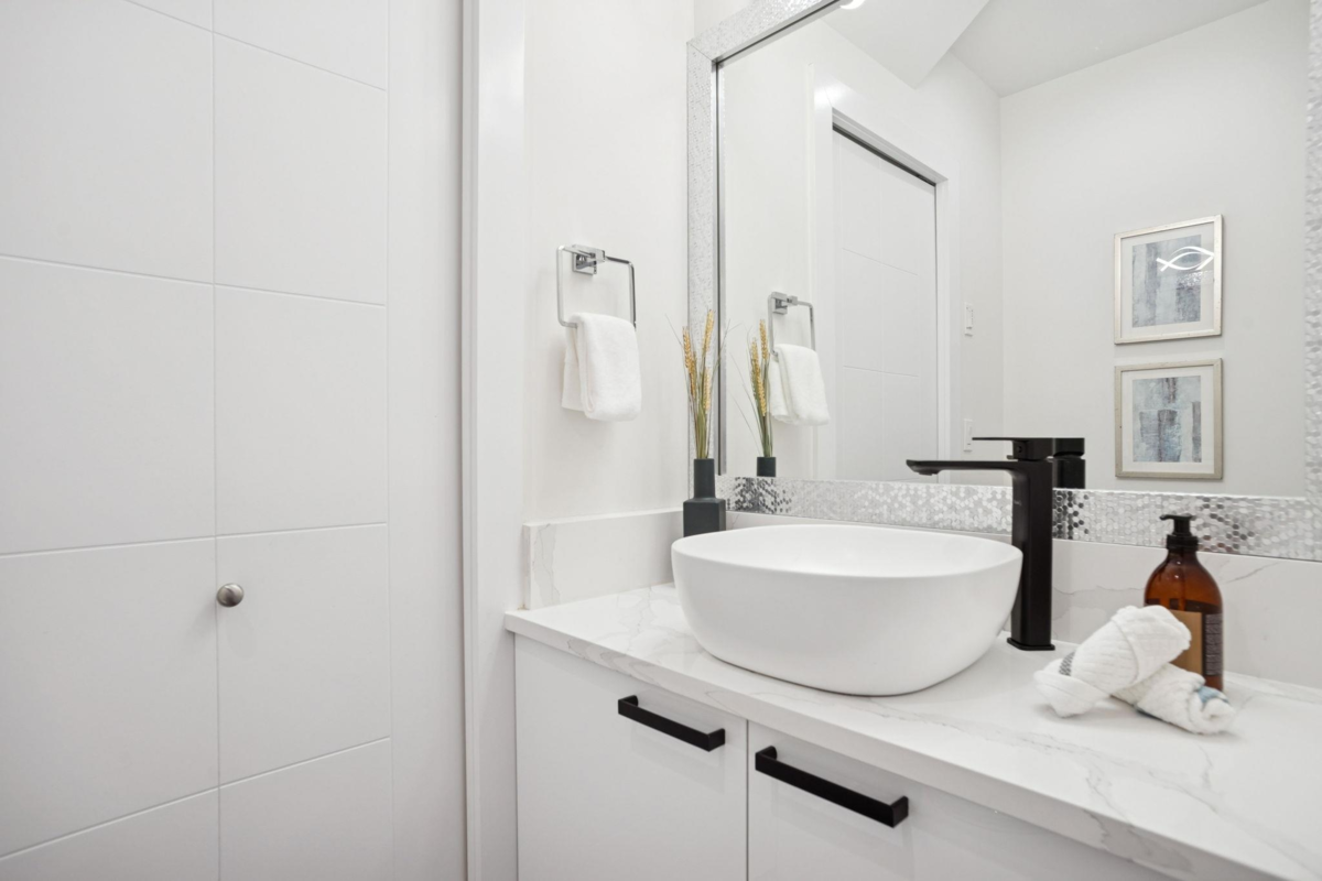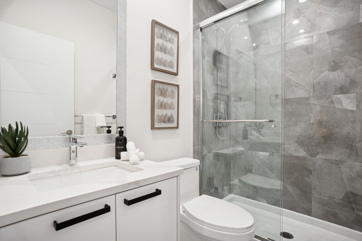 Well-designed 4 bed/4 bath modern duplex blends comfort, style, and function. Bright main living area features over-height ceilings and large windows that invite natural light. A well-equipped kitchen with quality appliances offers space for daily cooking and entertaining, while spa-inspired bathrooms add a relaxing touch. Stay comfortable year-round with radiant in-floor heating and A/C. Smart home features include built-in speakers, central vacuum, and a security camera system. The flexible main floor layout includes a bedroom, den, and full bath with separate entrance—ideal for a mortgage helper or in-law suite. Enjoy a fenced yard, single garage, and extra parking. Conveniently located within walking distance to local parks, community amenities, Highgate Shopping, top-ranked schools.