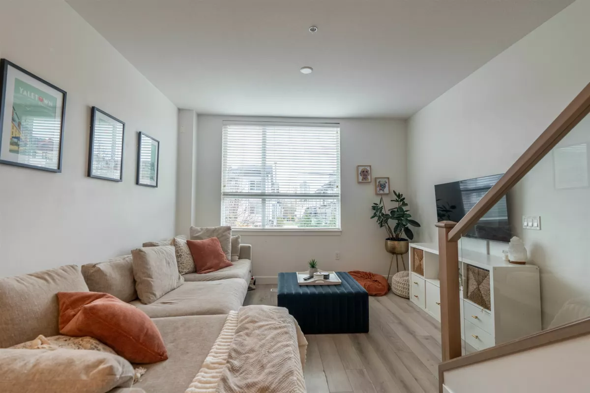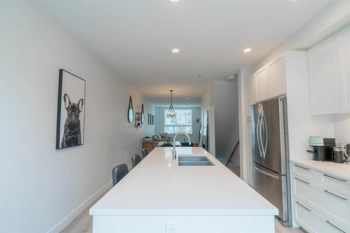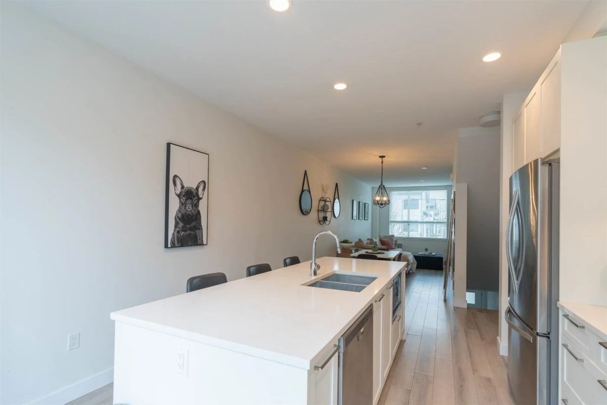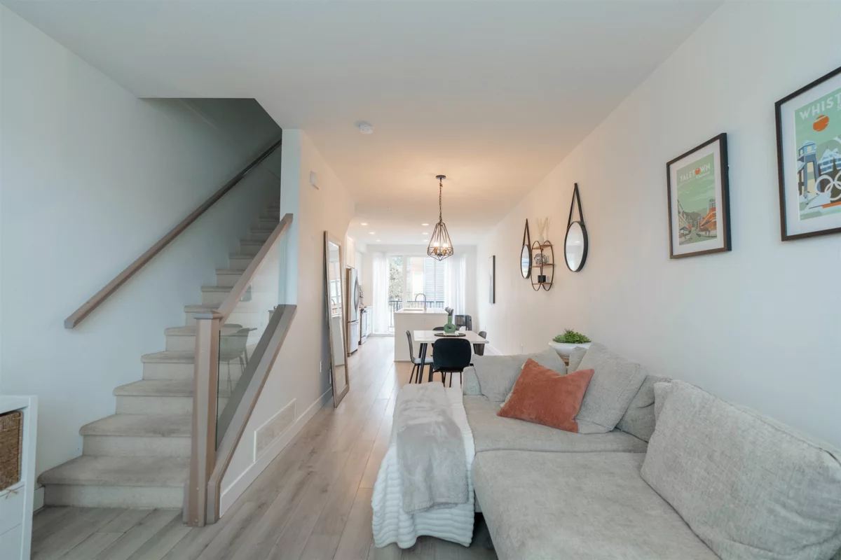Welcome to this Bright and modern 1,232 sq. ft. 2-bed + den townhome featuring 9 ft ceilings, open-concept living, and a quality kitchen with SS appliances, 5-burner gas range, hidden hood fan, French door fridge, quartz counters, and a large island. Enjoy comfortable main-floor living with forced-air heating, laminate/tile flooring, and plush carpeting upstairs.Two spacious bedrooms plus a flexible den—perfect for an office or nursery. West Coast exterior with hardy plank siding and cedar accents. Parking for two, easy street parking and a prime Willoughby location near parks, schools, shopping, and transit. A stylish, well-maintained home in a sought-after community. OPEN HOUSE Nov 29 & 30 (2-4PM)