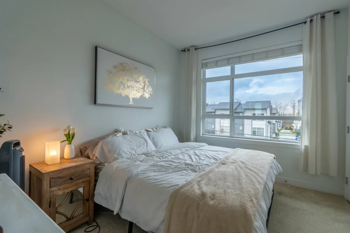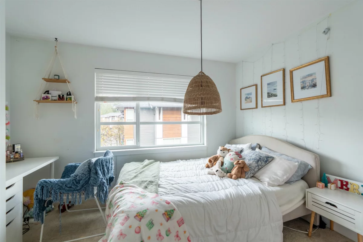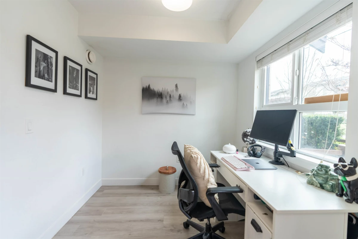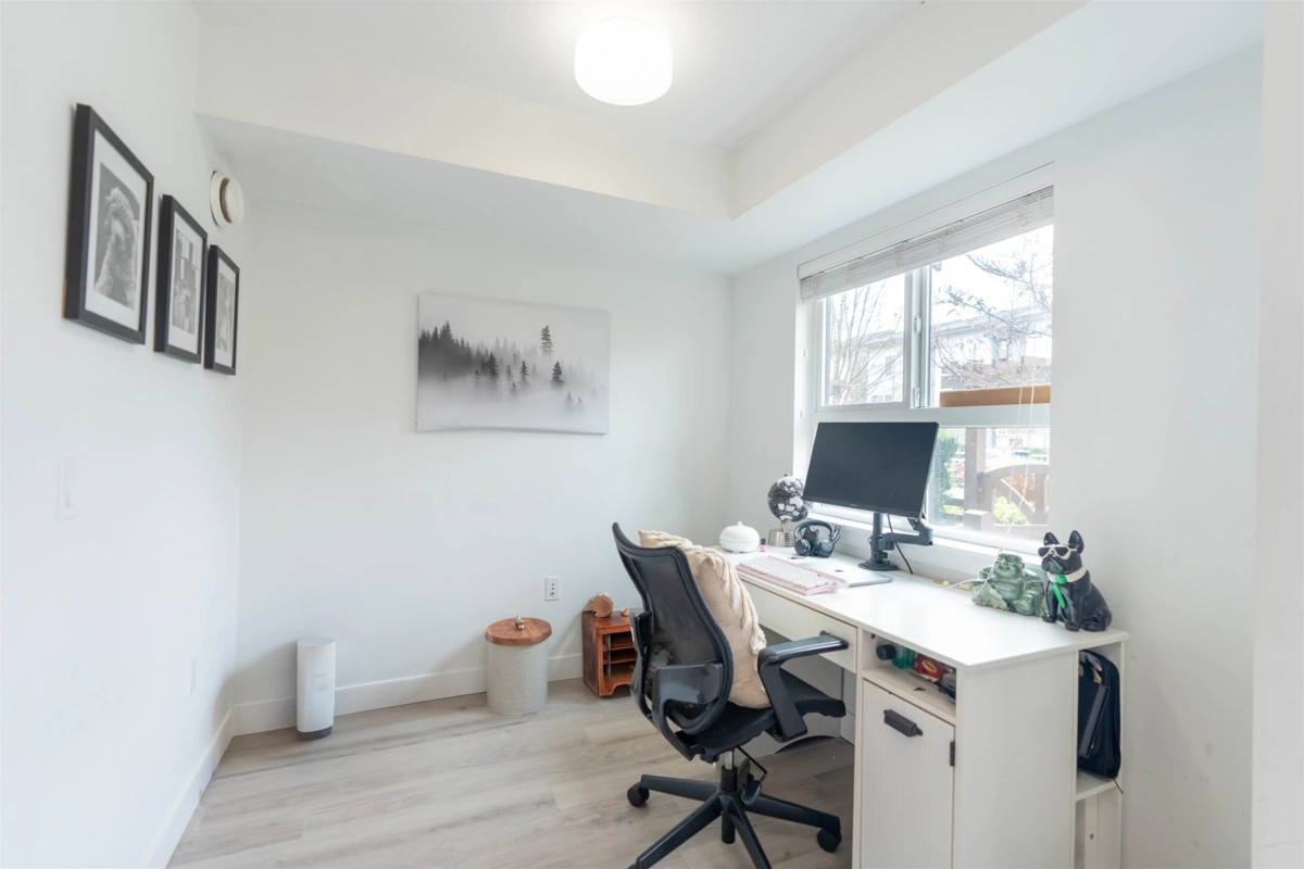 Welcome to this Bright and modern 1,232 sq. ft. 2-bed + den townhome featuring 9 ft ceilings, open-concept living, and a quality kitchen with SS appliances, 5-burner gas range, hidden hood fan, French door fridge, quartz counters, and a large island. Enjoy comfortable main-floor living with forced-air heating, laminate/tile flooring, and plush carpeting upstairs.Two spacious bedrooms plus a flexible den—perfect for an office or nursery. West Coast exterior with hardy plank siding and cedar accents. Parking for two, easy street parking and a prime Willoughby location near parks, schools, shopping, and transit. A stylish, well-maintained home in a sought-after community. OPEN HOUSE Nov 29 & 30 (2-4PM)