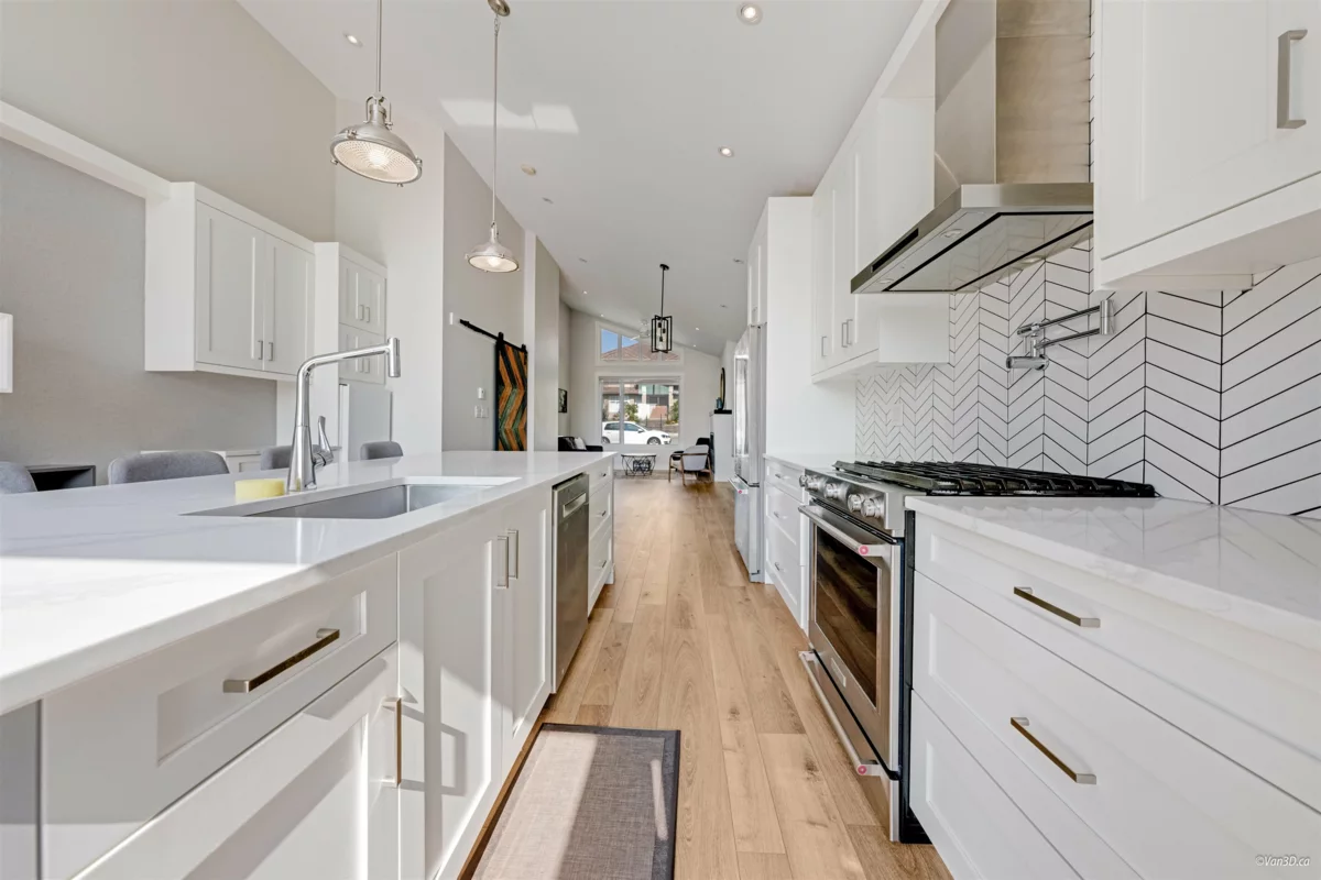 This rare mid-century modern rancher with basement is located in a sought-after neighborhood. The home boasts soaring 14-foot ceilings, expansive windows, and an open-concept design with 3-panel accordion doors off the kitchen, seamlessly blending indoor and outdoor living. The chef’s kitchen features premium KitchenAid appliances, gas range, and wine fridge, with German Grohe fixtures throughout for a touch of luxury and sophistication. A versatile flex room is ideal for a home office or entertainment lounge. Downstairs offers a spacious living area, large den (easily converted into a suite), and ample storage. This property includes a LEGAL 2-BEDROOM SUITE for mortgage support and the potential for a laneway home. Don’t miss your chance to own this exceptional home! OH Sunday Sept 28 2-4