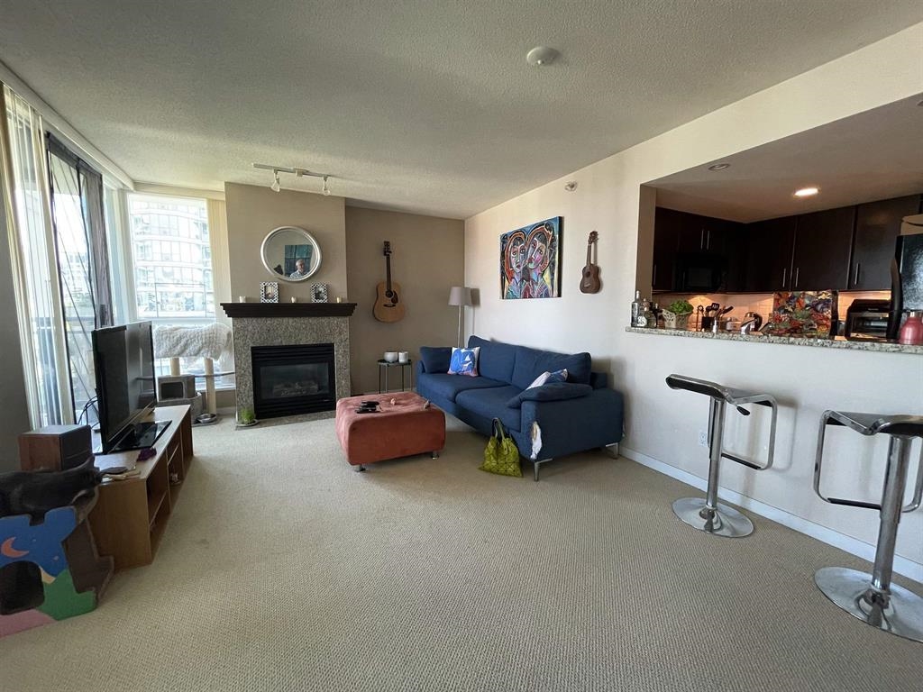 The Brighton by BOSA! This South-East facing corner home is bright with natural light and features views of the water and North Shore mountains. The gourmet kitchen boasts quartz countertops and a gas range, while the spacious living room is anchored by a feature wall and cozy gas fireplace. A large covered balcony extends your living space year-round, perfect for entertaining or relaxing. The versatile den can easily serve as a second bedroom. Enjoy the lifestyle you deserve in this well-maintained building with amenities: indoor pool, hot tub, steam room, sauna, and fitness centre. Just steps to Olympic Village, Yaletown and Gas town. Tenanted month-to-month; showings by notice