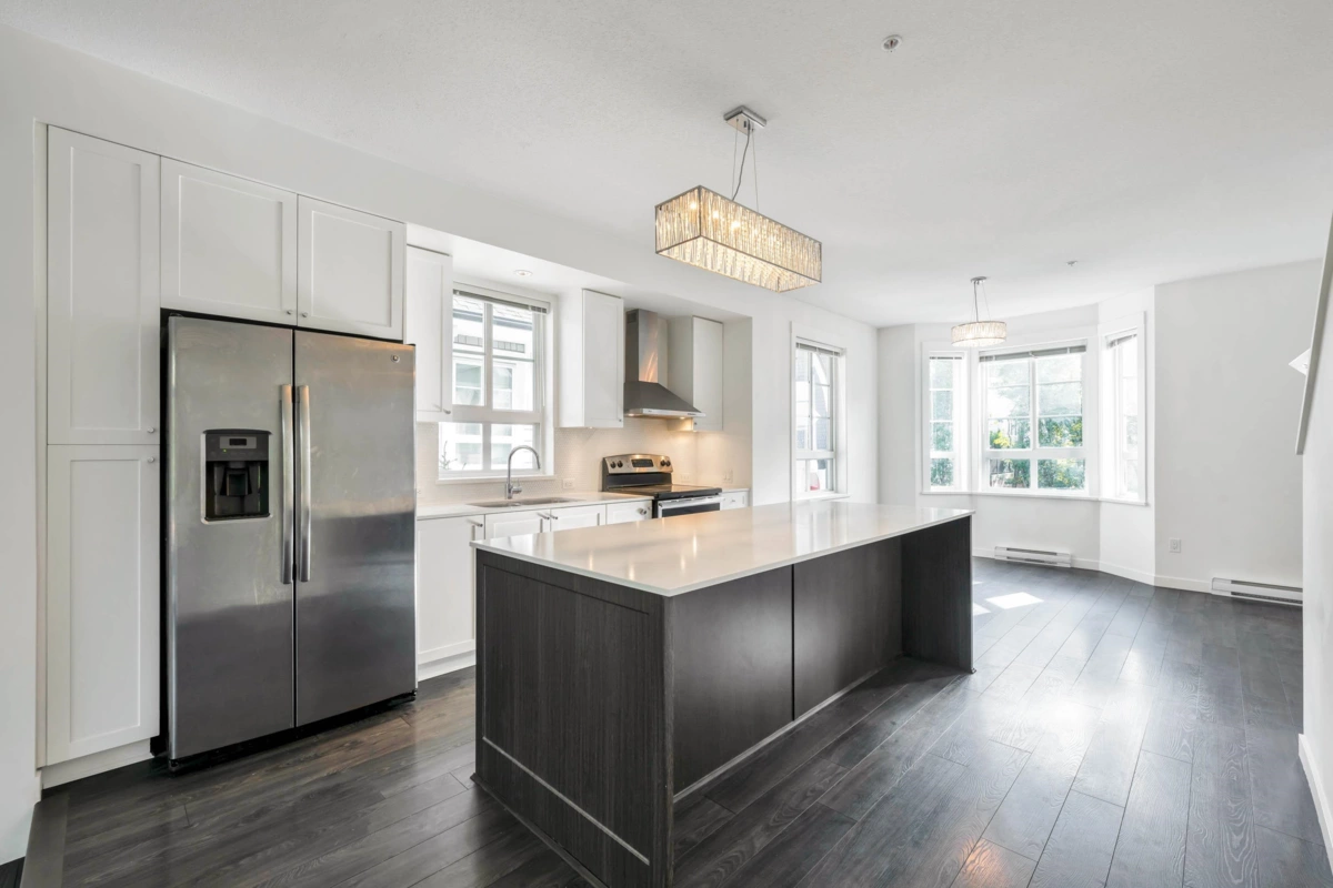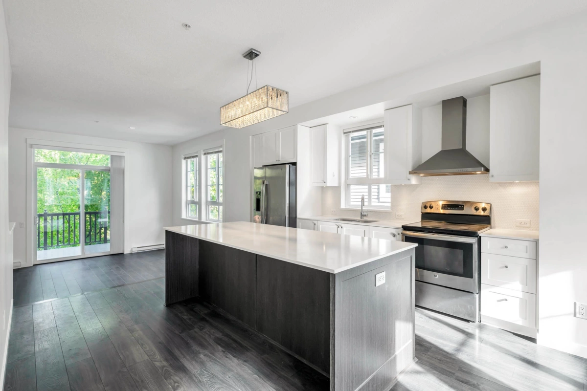 York by Mosaic! This bright & beautifully maintained End Unit offers an abundance of natural lights! The Open Concept main floor features a spacious living & dining area, perfect for entertaining. The Large kitchen is equipped with SS appliances, quartz countertops, leading out to the wide sun deck - ideal for relaxing /BBQs. Upstairs, there are generously sized 2 bed 2 bath, including a primary suite with ensuite. The extra long tandem garage offers ample storage space or the flexibility to add a home office/den. Step out from the garage to your own fenced yard backing onto green space, great for gardening/outdoor enjoyment. Visitor parking conveniently located next to & in front of the unit. Close to recreation, schools, shopping, easy access to HWY 1.