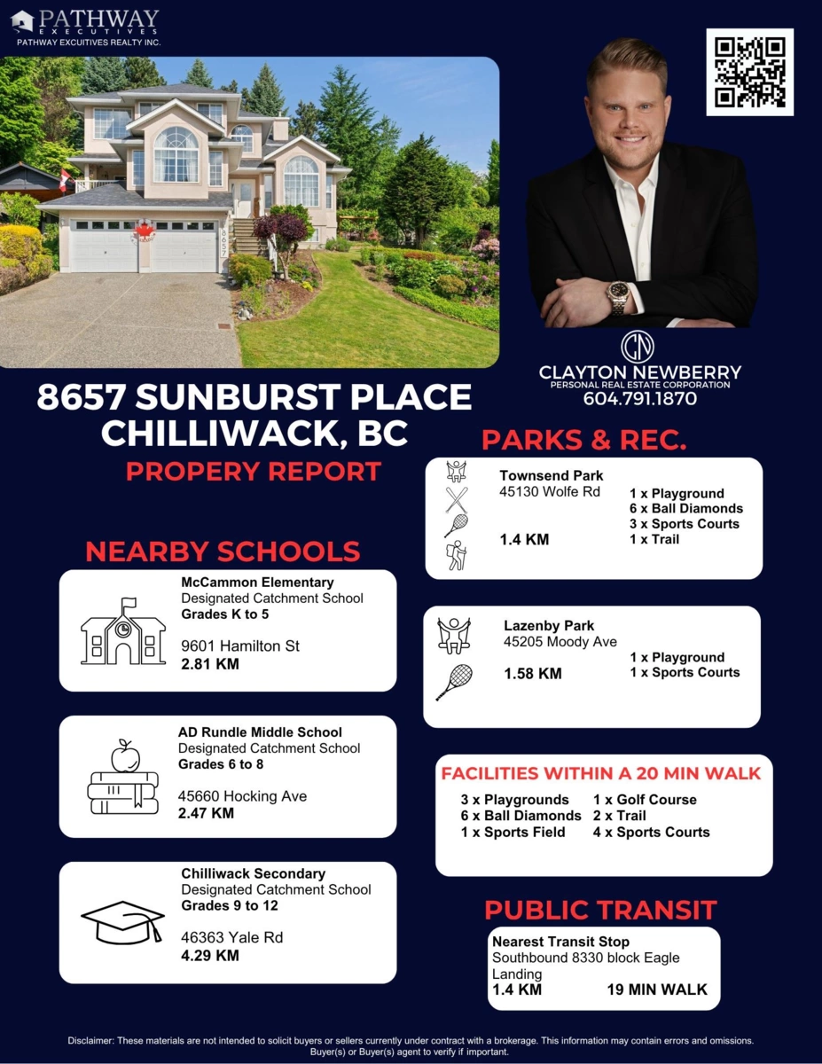 8657 Sunburst Place, Chilliwack, BC - MLS® R3062136 is the perfect home for those seeking a balance of tranquility, convenience, and community. With its excellent schools, safe and secure environment, and abundance of lifestyle amenities, this property is sure to impress. Contact me today to schedule a viewing and make this home yours!