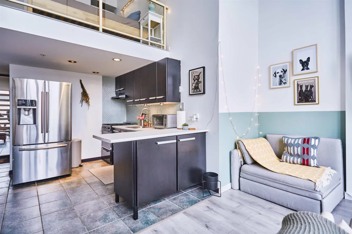 PENTHOUSE two-level loft at The Spot! Soaring 16’ ceilings and dramatic 16’ windows create stunning natural light throughout. Features include a penthouse-exclusive gas fireplace, gas stove, custom roller blinds, walk-in closet, and insuite laundry. Well-maintained building with full gym, party room, 2nd-floor patio with BBQ, and a 360° rooftop deck with panoramic views.
