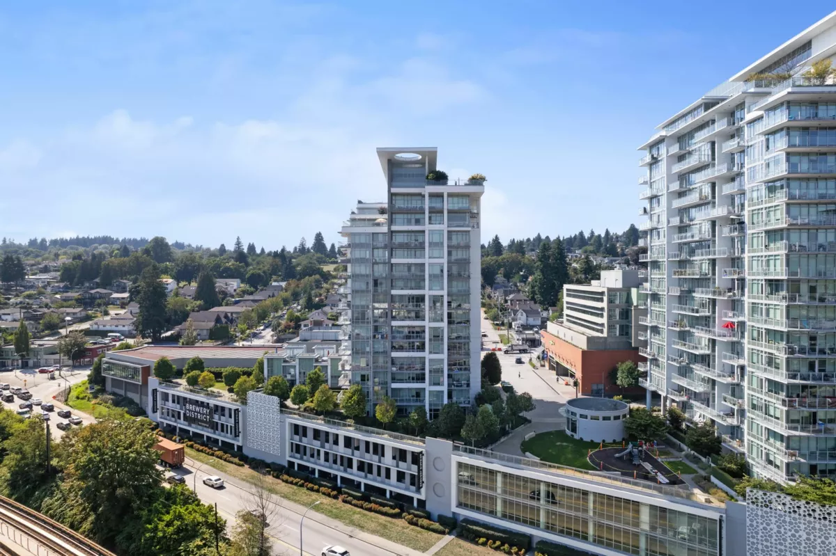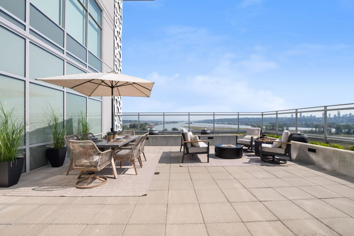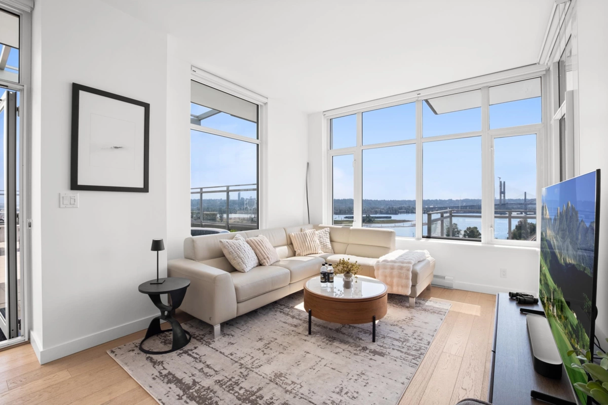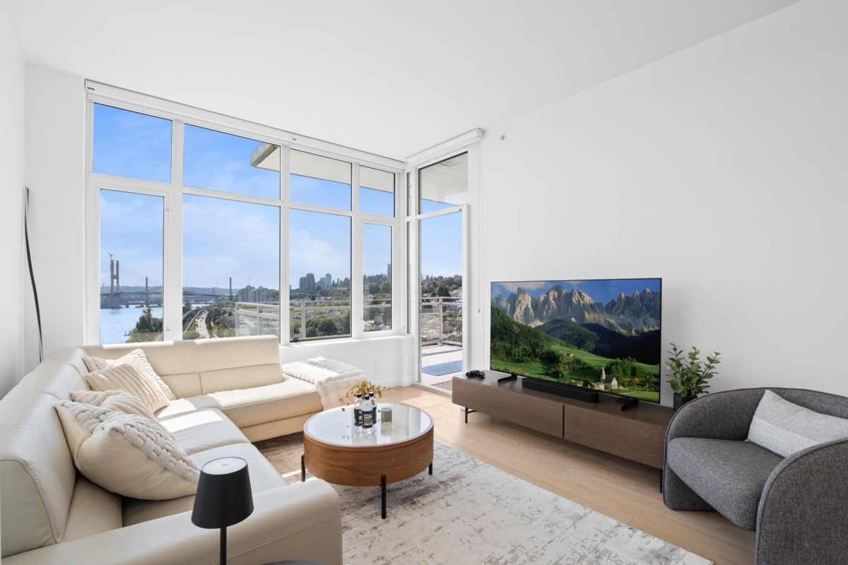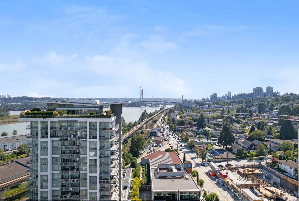 Rare sub-penthouse | 2 Bed, 2 Bath, 915 sq. ft. + 809 sq. ft. of outdoor living. A sexy, one-of-a-kind corner residence floating above the Fraser River with panoramic views of Mount Baker & Golden Ears. Featuring 9’ ceilings, floor-to-ceiling windows & $13K in luxury upgrades, this home flows seamlessly to 2 private patios — a 675 sq. ft. entertainer’s patio with gas/water hookups + a 134 sq. ft. retreat off the bedrooms. Resort-inspired living with a commercial gym, squash courts, yoga, steam, sauna & resident lounge. Includes 2 side-by-side parking + XL storage. Steps to SkyTrain, Royal Columbian Hospital, Save-On-Foods, Browns Socialhouse & Brunette Greenway. The Brewery District’s most exclusive lifestyle offering.