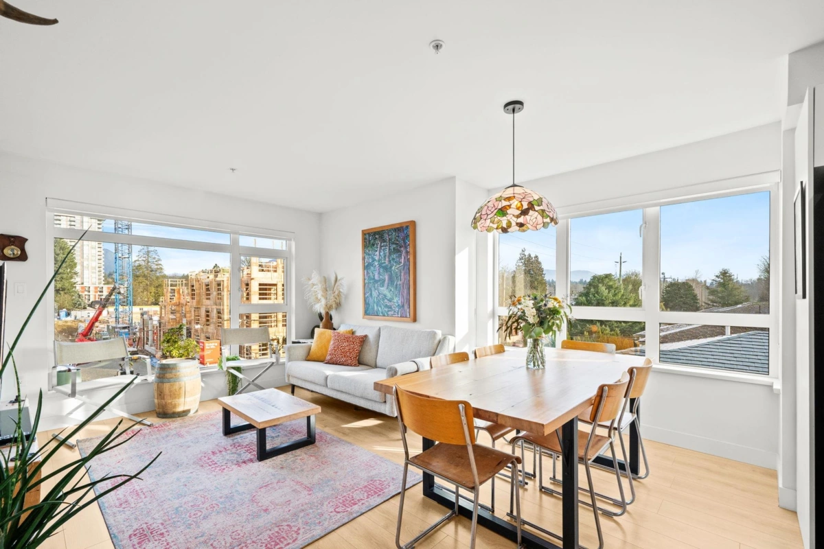 Unique: Corner Unit + Expanded Dining Area + Quiet Side! This exceptionally well-laid-out 1-bed + den, 1-bath home offers extra space and an extra sense of openness. This corner unit offers additional eastern exposure, flooding the home with natural light. Built by Mountain Creations and designed by Georgie Award–winning Eliza Sukava, the north-facing layout features a modern kitchen, premium finishes, and large windows with mountain outlooks. The original owners have cared for this unit meticulously - this home shows like new. The spacious bedroom fits a king-size bed, plus a large covered balcony, 1 parking, and 1 storage. Steps to trails, shops, cafés, Rec. Centre, daycares, and minutes to Lower Lonsdale, Deep Cove, Seymour, and Highway 1.