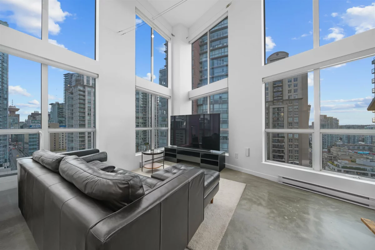 Absolutely STUNNING, fully renovated 2-level North-East corner loft at THE SPOT! Soaring double-height ceilings flood the space with natural light, highlighting polished concrete floors and a sleek chef’s kitchen with quartz counters, stainless steel appliances, soft-close cabinetry, breakfast bar and the spa-inspired bath with walk-in shower. Bespoke steel staircase leads to a spacious upper bedroom with workstation, walk-in closet, and insuite laundry. Unique West-Coast reclaimed wood accents throughout - custom barn door, shelves, stair treads and flooring. BONUS: Private covered balcony for fresh air and city vibes! The Spot's amenities include concierge, gym, lounge, BBQ terrace, and rooftop decks. 1 Parking included. Pet and short-term rental friendly building. This is a MUST SEE!