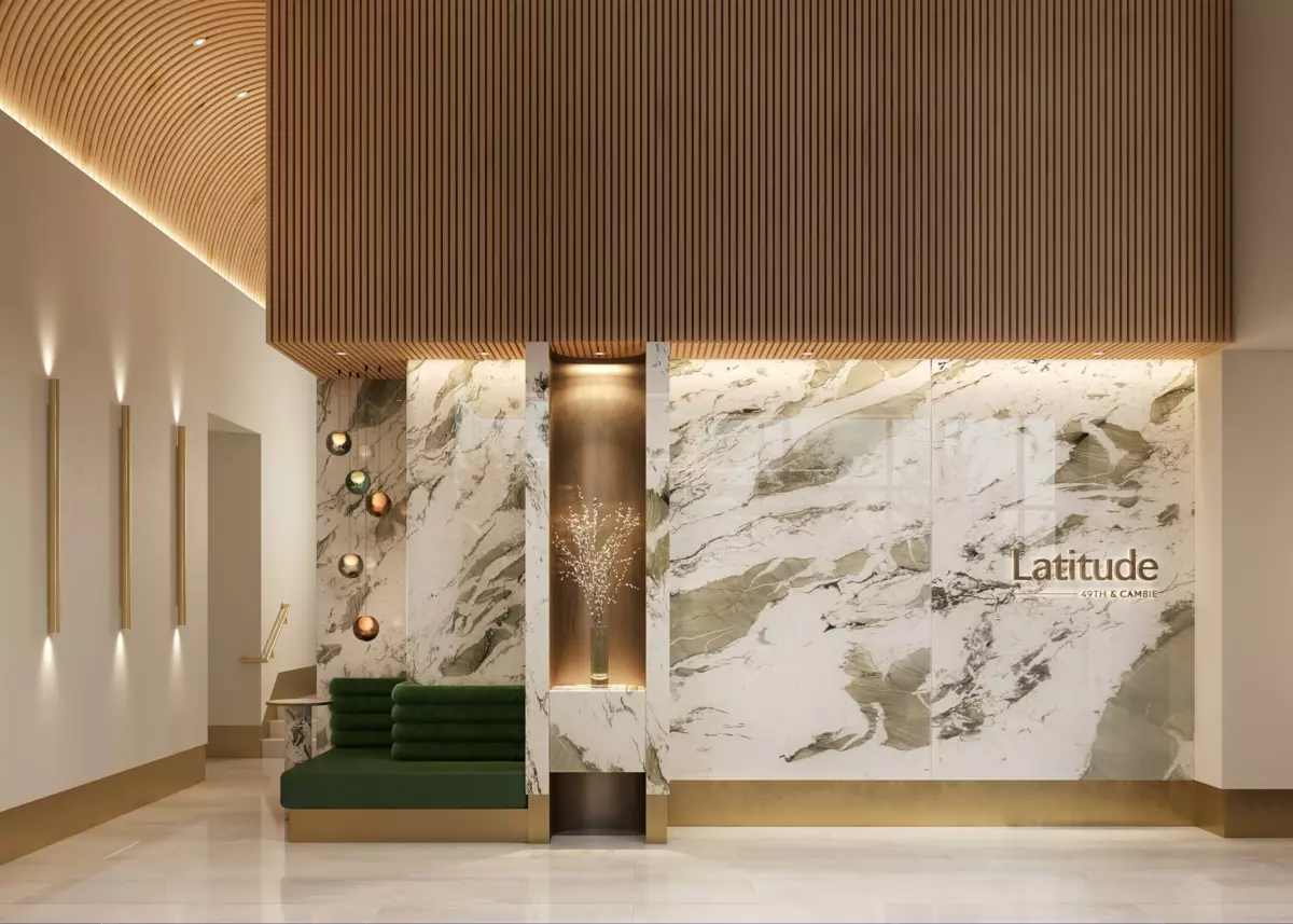 Situated in Vancouver's coveted West Side Oakridge area at Cambie Street and West 49th Avenue, Latitude offers exceptional connectivity within a quiet, family-oriented neighbourhood. Steps from the Canada Line with seamless access to Downtown, Oakridge, and YVR, this 2 bedroom and den home features a smart, functional layout. The L-shaped kitchen is finished with European-inspired cabinetry, quartz countertops, and premium Miele appliance package including gas cooktop and speed oven. Mosino's smart entry system integrates with Ecobee thermostat and Hilo Smart Mirror, offering keyless access, climate control, lighting, and connected daily living. Well-separated bedrooms provide privacy, while the versatile den is ideal for a home office or flex.