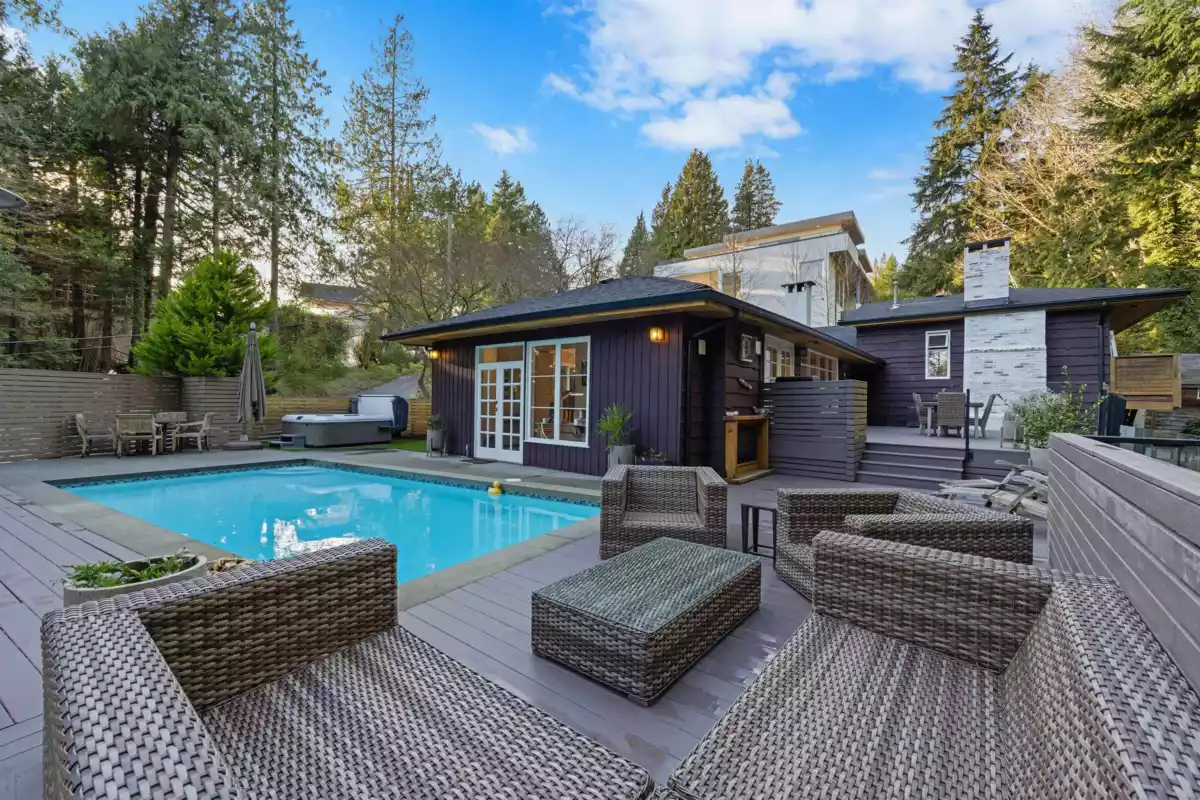 Beautifully maintained home set on a private ½ acre+ lot just moments from Stearman Beach. The bright open-plan main floor features hardwood floors, abundant windows, and French doors leading to expansive sun-filled decks, pool and hot tub — perfect for indoor-outdoor living. The inviting living and dining areas offer a wood-burning fireplace, while the kitchen includes stainless steel appliances and excellent prep space. Two bedrooms, laundry and a flexible office/family room complete the main level. A serene primary suite sits just above with a spa-like ensuite. Downstairs offers a rec room with fireplace and a sauna. Close to 3 Cypress/Caulfeild schools, Isetta Bistro, shopping and the beach.