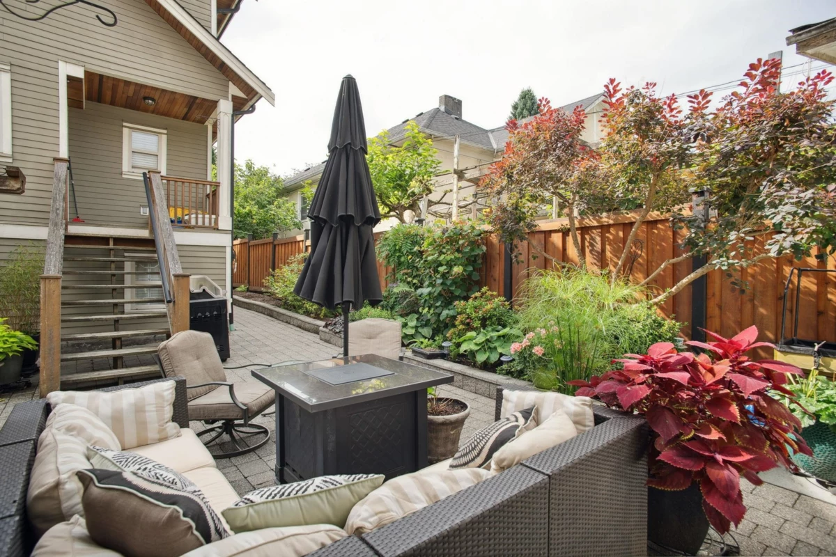 Welcome to this RARE Cedar Cottage COACH HOUSE nestled in a vibrant family-friendly neighborhood! This open-concept main floor features a Bright living room with Large windows, custom built-ins & a cozy gas fireplace. The updated kitchen boasts high-end S/S appliances, including a NEW Gas Range Stove, LG Fridge & Miele Dishwasher, along with granite countertops, ample cabinet space & NEW Miele Washer/Dryer. Master bedroom offers an ensuite bath & walk-in closet, while two additional well-sized bedrooms share a convenient "Jack & Jill" bathroom - perfect for kids. Parking & Storage. Relax on the spacious LARGE South-facing front Patio with Shared Garden! Nearby Charles Dickens Elementary & More!