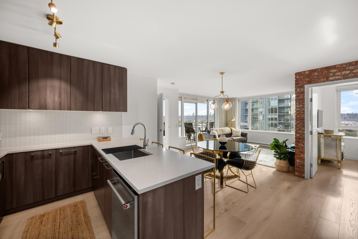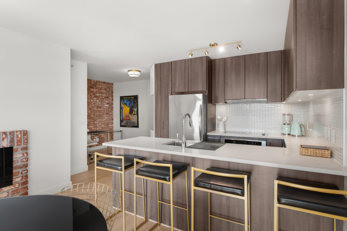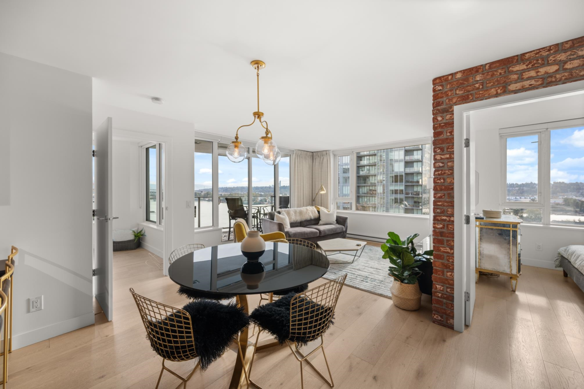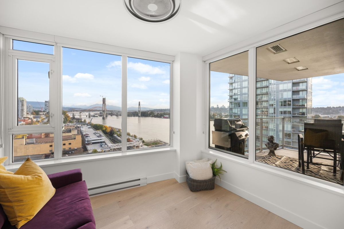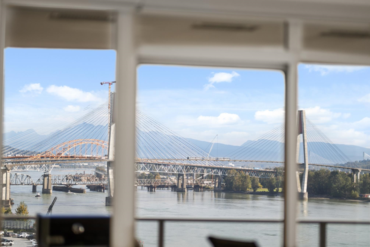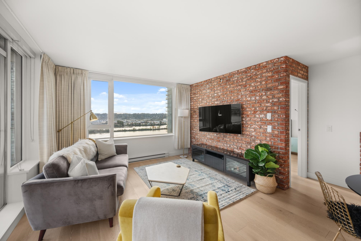 View & Location! This STUNNING 2 BDRM 2 BTHRM + DEN corner unit at Trapp + Holbrook! A blend of modern comfort, custom upgrades & an unbeatable location! Enjoy sweeping views of the Fraser River & mountains from every room. Stylish living space filled w/ natural light, featuring exposed brick walls, designer paint, engineered HW flooring & new light fixtures throughout. The unit impresses w/ a custom pull-out pantry, sleek quartz counters, a stylish tile backsplash, premium S/S appliances, built-in storage, an inviting electric fireplace & custom window coverings. Steps to SkyTrain, shopping, restaurants, Pier Park & River market! Amenities include Gym, Clubhouse, rooftop deck w/ gas fire pit & BBQ. 1 Secure U/G Parking & 1 Locker!
