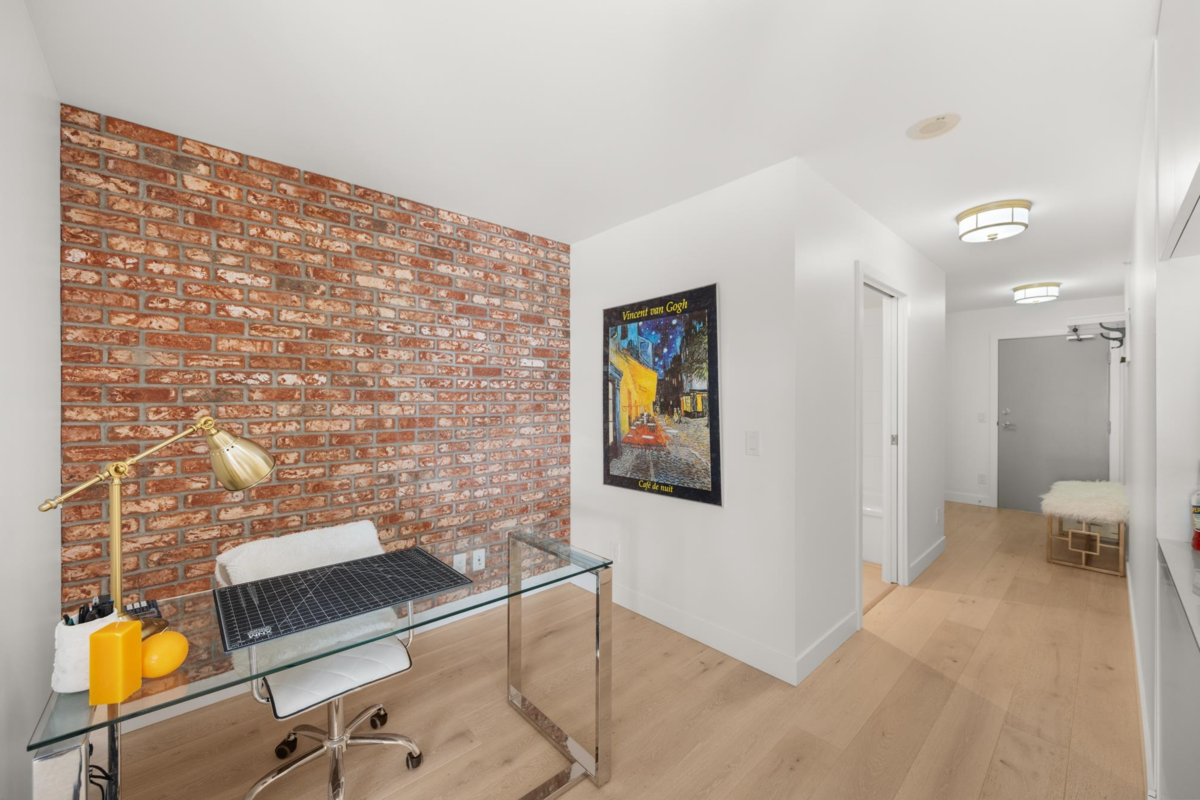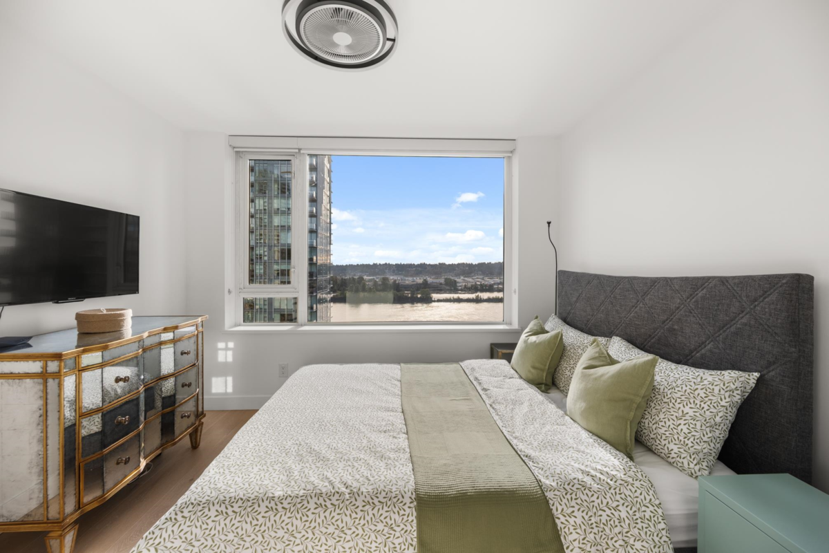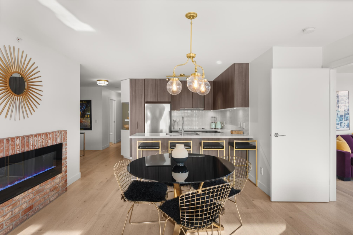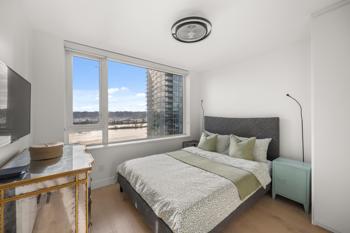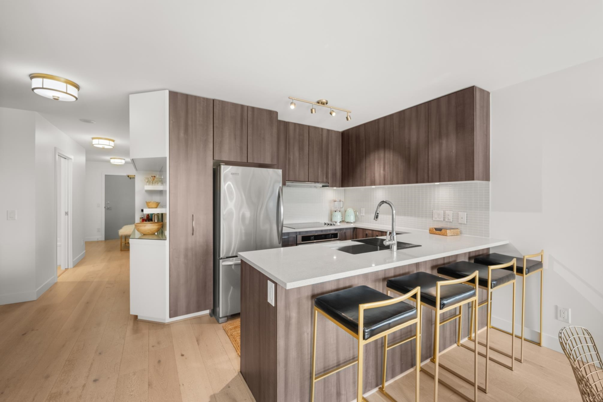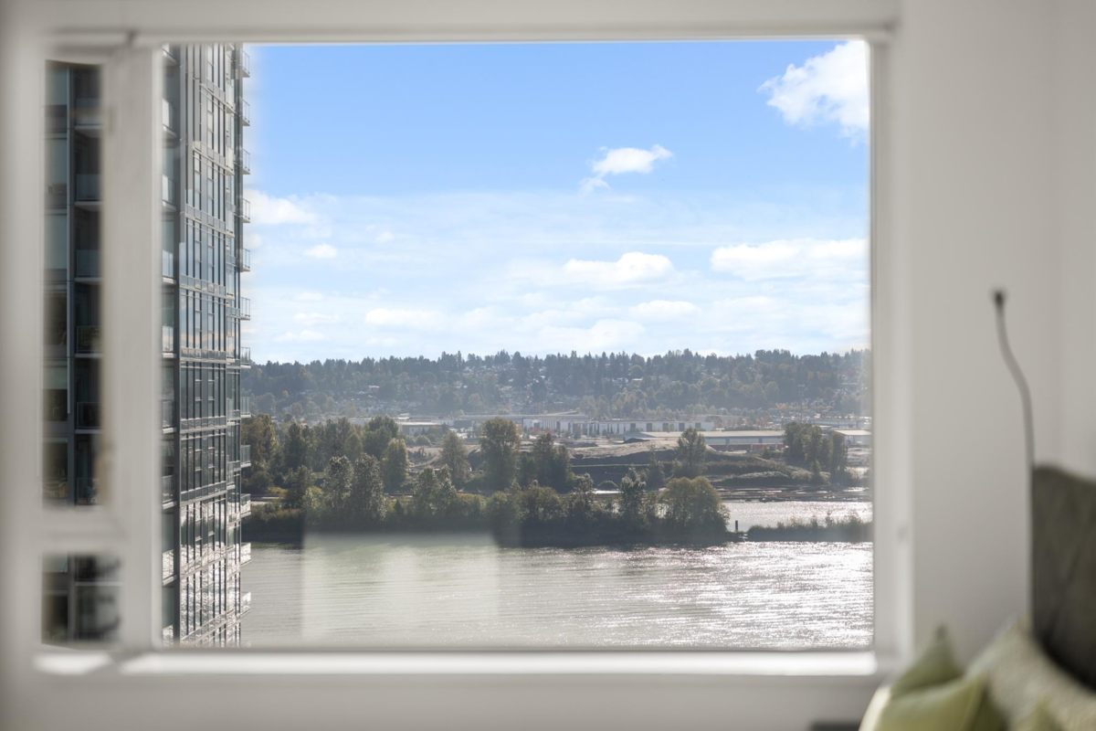 View & Location! This STUNNING 2 BDRM 2 BTHRM + DEN corner unit at Trapp + Holbrook! A blend of modern comfort, custom upgrades & an unbeatable location! Enjoy sweeping views of the Fraser River & mountains from every room. Stylish living space filled w/ natural light, featuring exposed brick walls, designer paint, engineered HW flooring & new light fixtures throughout. The unit impresses w/ a custom pull-out pantry, sleek quartz counters, a stylish tile backsplash, premium S/S appliances, built-in storage, an inviting electric fireplace & custom window coverings. Steps to SkyTrain, shopping, restaurants, Pier Park & River market! Amenities include Gym, Clubhouse, rooftop deck w/ gas fire pit & BBQ. 1 Secure U/G Parking & 1 Locker!