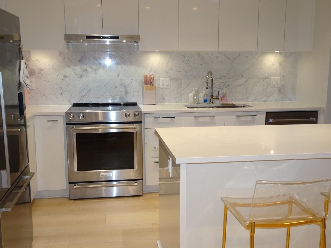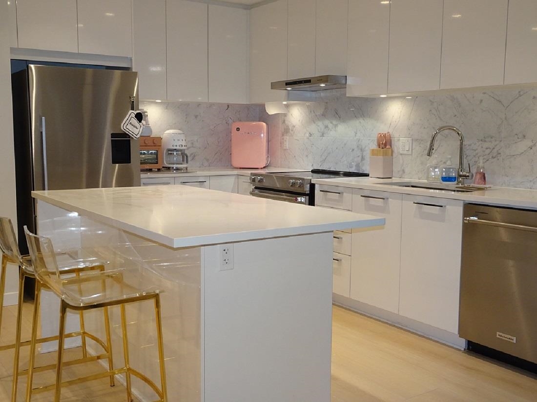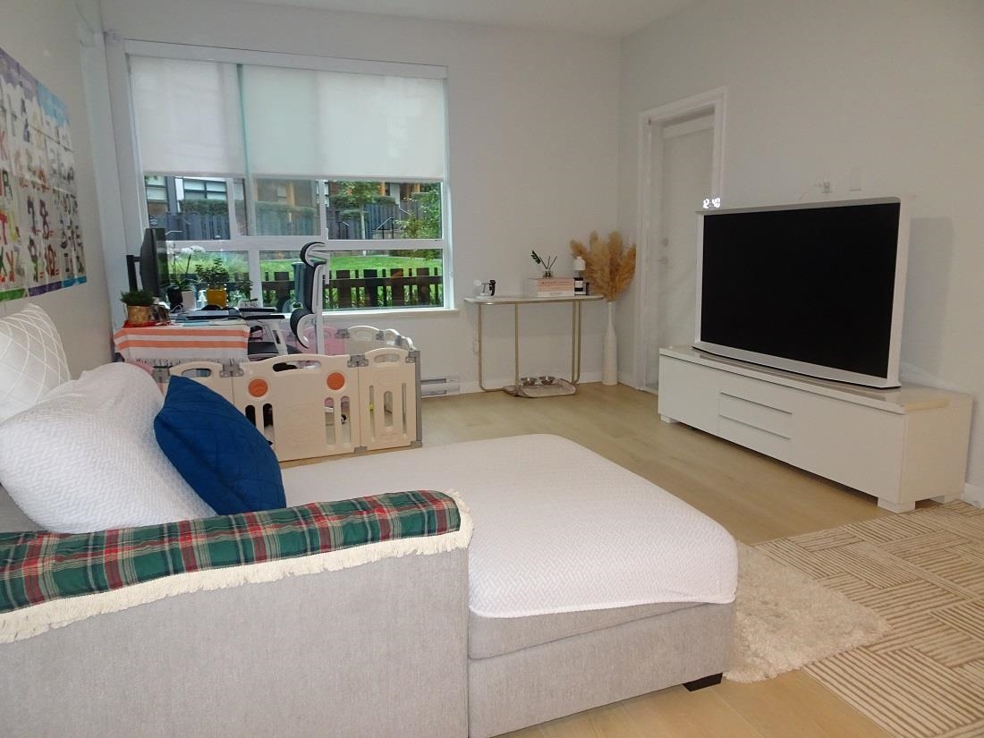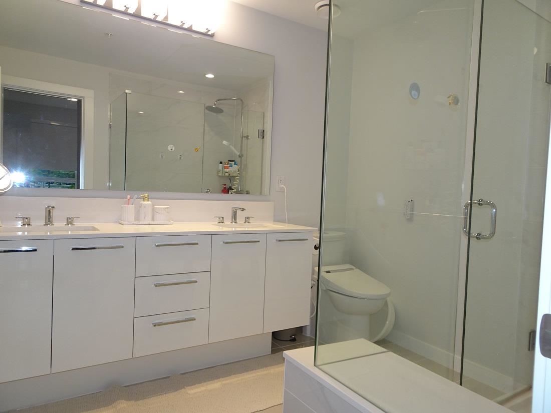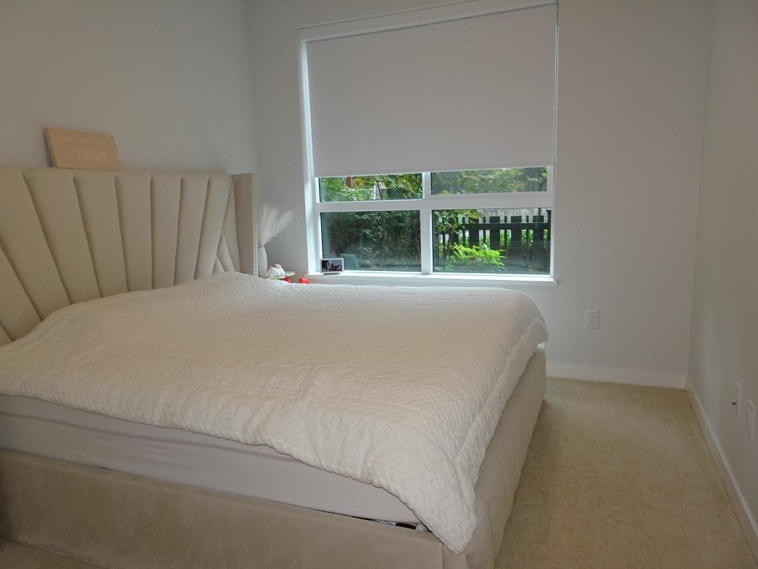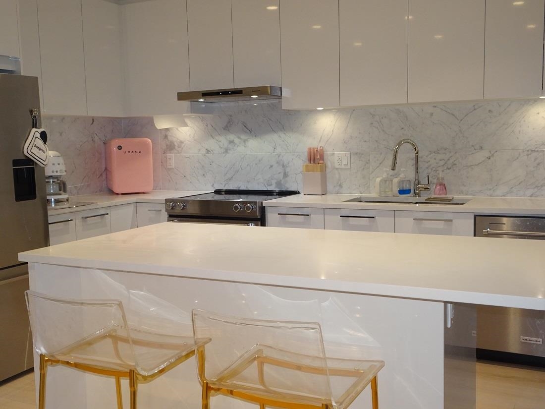 Welcome to Polygon's Byrnepark in South Slope!! This 2 bedroom 2 bath home provides an open plan with high ceilings for that open air feeling. Enjoy the patio that faces the courtyard and is unique in that you can access your suite from courtyard with playground rather than hallway. Bedrooms are across from each other to ensure extra privacy. The Primary bedroom features a walk in closet, double sinks and spa shower with built in bench. Kitchen features light colour cabinetry, modern stainless steel appliances, full height marble tile backsplash, stone countertops and an island for extra counter space. Laminate flooring throughout. Great location close to Riverway Golf Coure. Easy access to Marine Way, Market Crossing shops including Save On Foods, Winners, Starbucks, Canadian Tire.