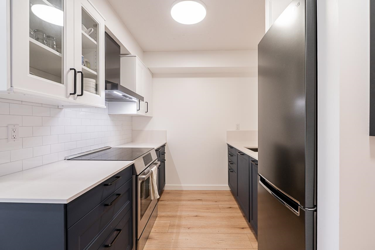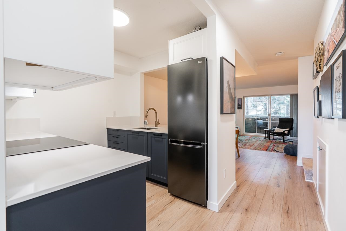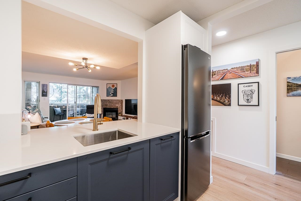LARGE 2 BEDROOM PLUS DEN move-in ready townhome walking distance to shopping and amenities. This home has been tastefully updated with a new stylish kitchen, laundry room and new flooring. The kitchen has all new cabinets, countertops, appliances, sink and fixtures. The living space is large and open with a cozy gas fireplace and opens to a fully covered private balcony. There is a bonus flex space on the main floor - perfect for a home office or kids play area! Upstairs you'll find 2 bedrooms, 2 bathrooms and a laundry room. The primary bedroom will easily fit your king size bed. The laundry room is fully renovated with full size side by side washer & dryer plus extra storage and clothes hanging space. There is a dedicated EV charger and 2 parking. Book a private showing.