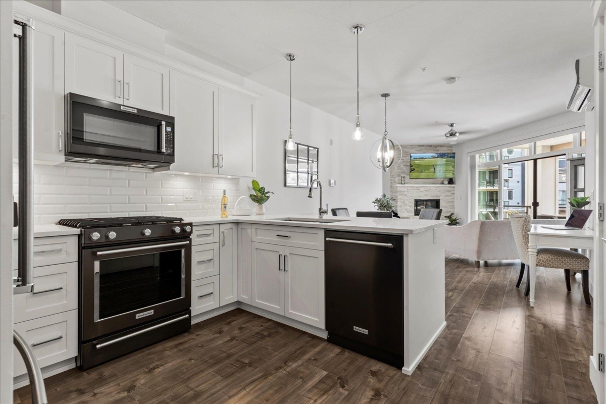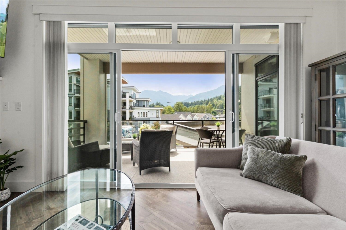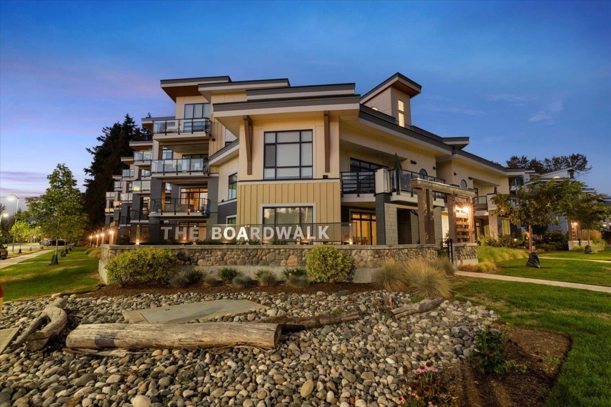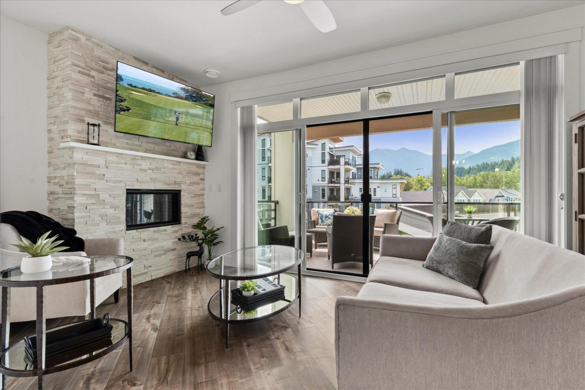 Modern living in an unbeatable location—just steps from the Rotary Trail, Vedder River and the shops at Garrison Crossing! This beautifully designed 875 sqft 1-bedroom, 1 bathroom condo offers a bright and airy layout with high-end finishes throughout and expansive mountain views from your large, private covered patio. The sleek kitchen features KitchenAid black stainless appliances, a gas range, quartz countertops, soft-close cabinetry, a breakfast bar and stylish subway tile. The spacious bedroom includes a large walk-in closet and a gorgeous spa-inspired ensuite with double sinks, soaker tub and glass shower. Stay comfortable year-round with A/C. The Boardwalk is pet friendly, has no age restrictions, has secure parking, large storage lockers and low strata fees! Call to view!