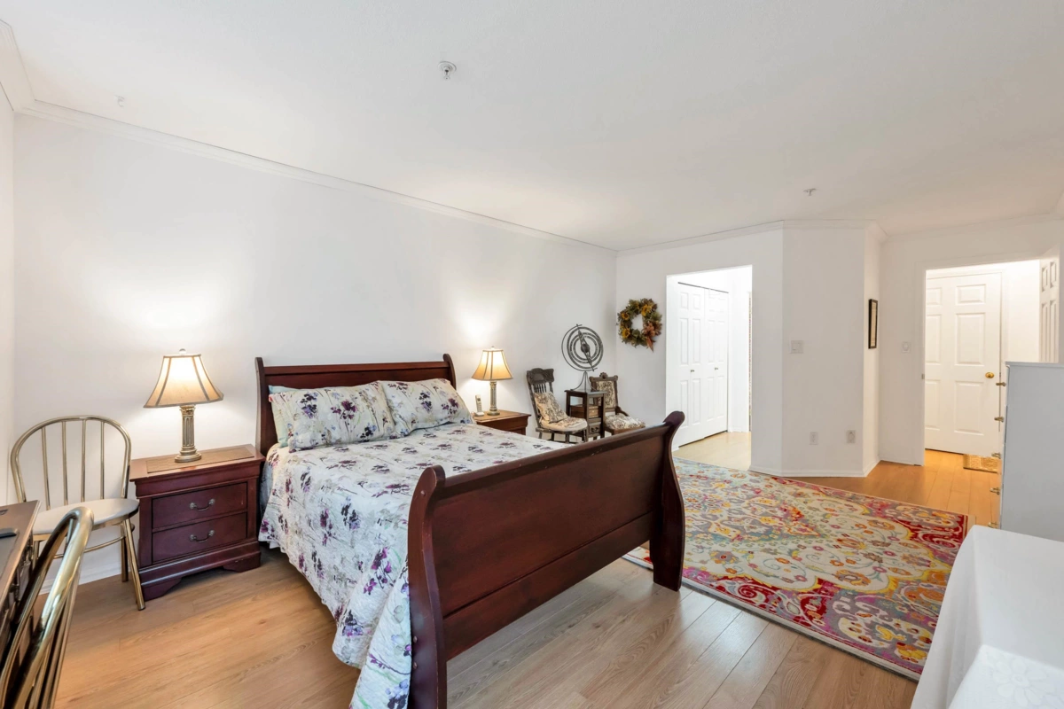 THE COURTYARDS. Lovely and bright two bedroom top floor condo with a south facing balcony to enjoy the sun. Spacious dining and living room with a south facing bayed window. Bright white kitchen with updated flooring, fridge and stove (2021), washer and dryer (2021). Huge primary bedroom has a bayed window, double closets and ensuite. The second bedroom has French doors off the living room and is being used as an office. Bathrooms have updated vanities, h/e toilets and flooring. Building was rainscreened several years ago and the roof, windows and doors were replaced too. Wonderful central location only steps to Semiahmoo Mall, public transit, the library, restaurants and Bakerview Park. Non smoking building and one pet is welcome. This home is ready for you to move right in!