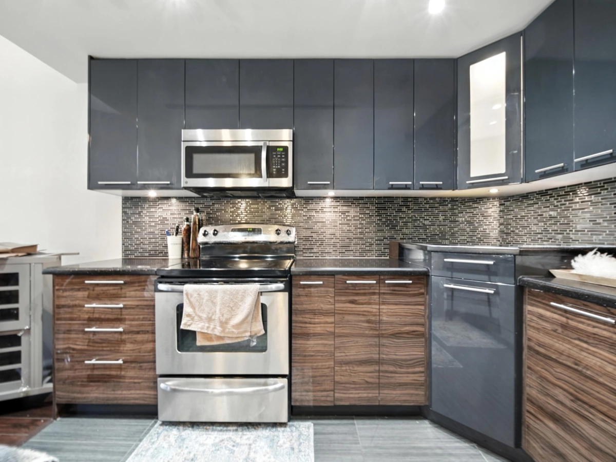 Welcome to Luxor-Where style meets convenience. Top floor East-facing Penthouse overlooking the courtyard! This lovely home offers an open and airy feel, accentuated by vaulted ceilings that flood the space with natural light. Thoughtfully designed for modern living, this 1-bed, 1-bath residence includes one secure parking stall and showcases premium finishes throughout. From porcelain tile floors and glass tile backsplashes, elegant quartz countertops and lacquered cabinetry, soft close doors and high end fixtures, this home is a delight! Whether you're a first-time homebuyer or a savvy investor, this home is a perfect blend of luxury and practicality in a vibrant, well-connected location. Building amenities feature a gym, guest suite, lounge area, and gardens! virtually staged pics