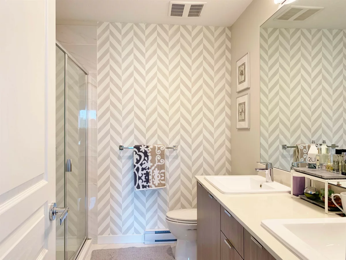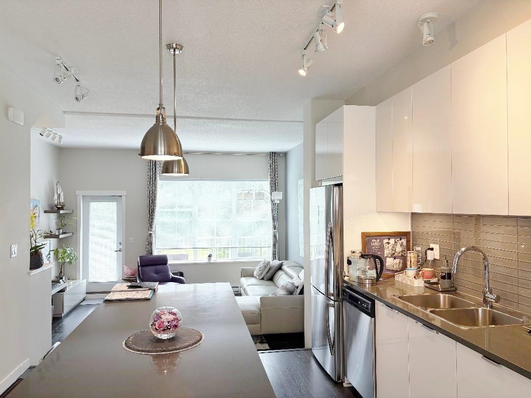 This rare 2-bedroom townhome offers the space and flexibility of a 3-bedroom layout, with nearly 1,400 sq.ft. of thoughtfully designed living space. The open-concept main floor is ideal for entertaining, featuring a large island kitchen with Caesarstone countertops, stainless steel appliances, double sinks, and sleek cabinetry. A sunken living room with soaring ceilings opens to a spacious sundeck overlooking the lush golf course. Upstairs, the king-sized primary suite boasts a walk-in shower with bench, double sinks, and stone counters. The oversized second bedroom offers potential to be divided into a third room. Recently updated with $18,000 in tasteful upgrades, including new entry floor tiles, laminate stairs, and designer wallpaper. Meticulously maintained and truly move-in ready.