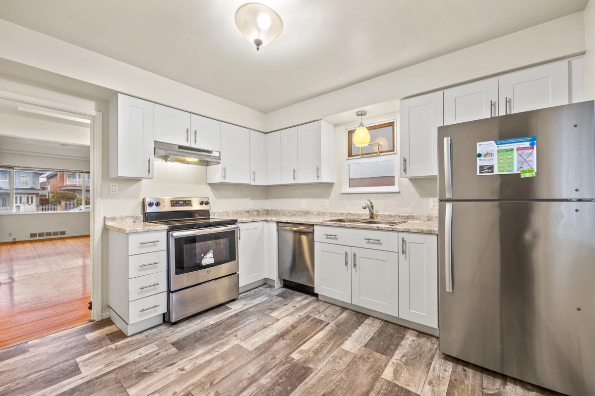 Nestled on a quiet street in the highly sought-after Brentwood Park neighborhood, this delightful and beautifully updated bungalow offers the perfect blend of character and modern comfort. Renovations are including a brand-new kitchen and bathrooms with elegant shaker-style cabinetry, fresh designer paint colors, and new appliances. The home also features a newer (2021 ) roof, vinyl windows, and updated vinyl flooring in the sun-filled solarium. The spacious main floor boasts two bedrooms, a bright living room, and a formal dining area with stunning inlaid oak floors. The fully finished basement, with its own private entrance, offers exceptional flexibility — complete with two additional bedrooms, a full kitchen and bath, a generous sitting area, walking distance to shops, transit.
