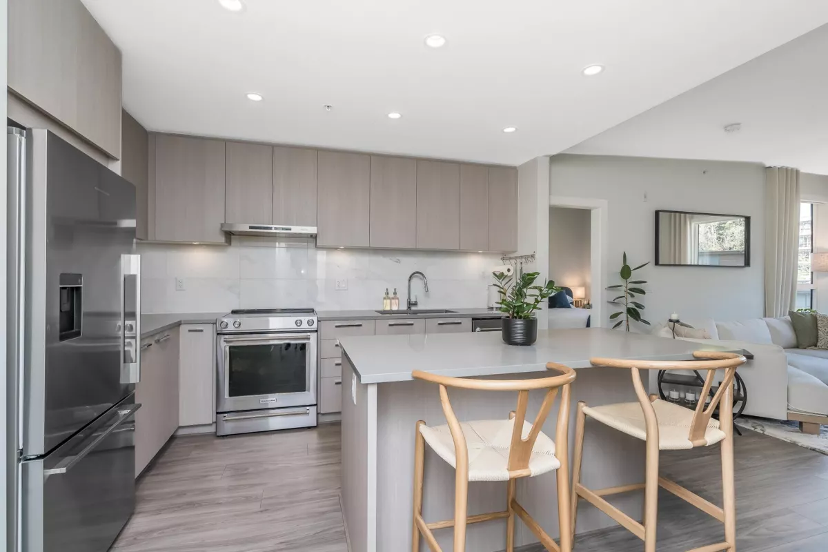 This meticulously maintained, top-floor penthouse is like new & has a serene treed & garden view, not directly facing another unit. The excellent floor plan has 2 bedrooms separated by living space, & the spacious primary bedroom features a walk-in closet & spa-inspired ensuite. The gourmet kitchen has stone counters, a large island & lots of storage. Expansive windows throughout allow lots of light. Unbeatable location: close to Market Crossing shops, restaurants, groceries, public transit at your door & walk to Edmonds Skytrain. Outdoor enthusiasts will love the proximity to Byrne Creek Park, hiking trails, bike park, basketball courts, & an off-leash dog park. Quality built by Polygon with a gym & playground. 1 EV-Ready stall plus street parking, & TWO Large Lockers! 2 Pets allowed.