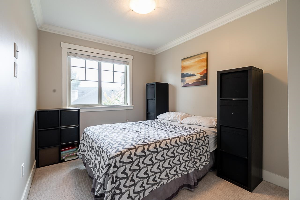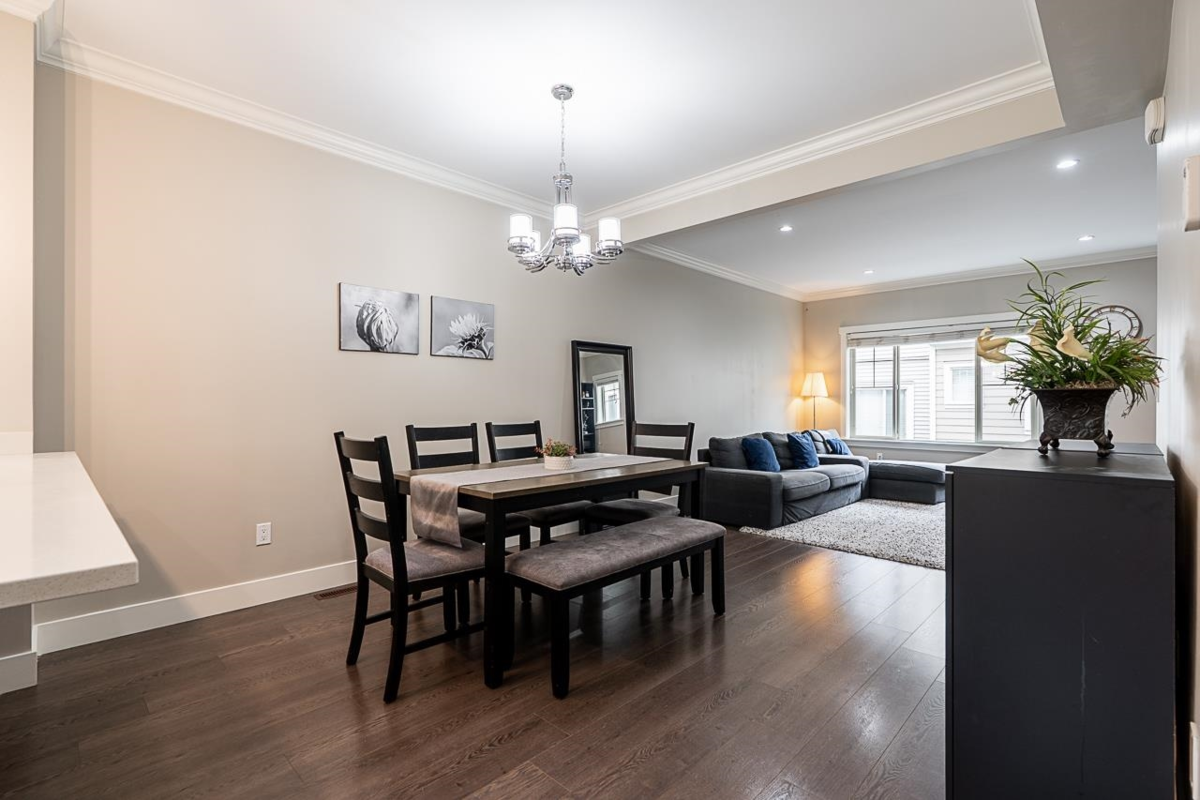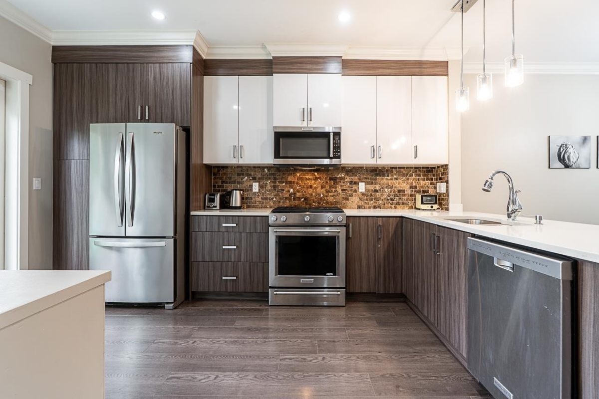 Immaculate 10-yr old townhouse featuring 3 spacious brms and 2.5 baths in a prime central location. This beautiful home offers a generous backyard that backs directly onto the playground—perfect for children to play and pets to enjoy. Beautiful modern kitchen for the chef in the family with quartz countertops, breakfast bar, gas range for gourmet cooking, S/S appliances, and tons of counter and storage space. Great open concept layout on the main level with a bonus powder room. Conveniently located near transit, just steps away from the upcoming SkyTrain station, parks, schools, shopping and restaurants across the street.