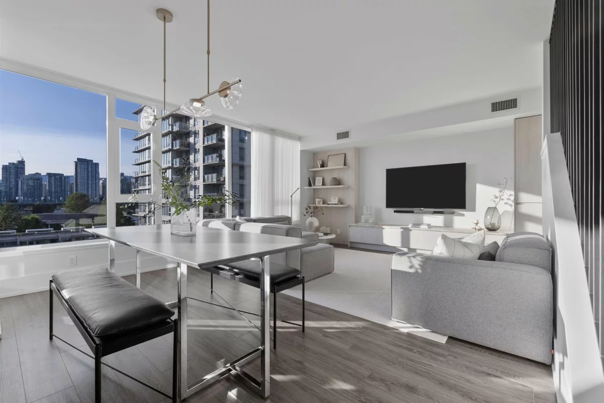 Completely redesigned, this Penthouse 2-level home features central AC & heating, full northwest window exposure w/ city views, extensive millwork and stone throughout, as well as custom draperies & auto blinds. The kitchen as integrated fridge & dishwasher, Fisher&Paykel gas cooktop & convection oven, honed quartz countertops with backsplash, and a showpiece travertine stone island. The living room includes a built-in media unit with storage, open display shelving & concealed bar. The den add more additional storage or a home office set up, while there is a huge bonus storage area under the stairs. Upstairs are 2 bedrooms, the primary with custom king bed and walk-in closet, stacked laundry, a built-in work area, and a sprawling terrace with afternoon/evening sun. 1 Parking & 1 Big locker